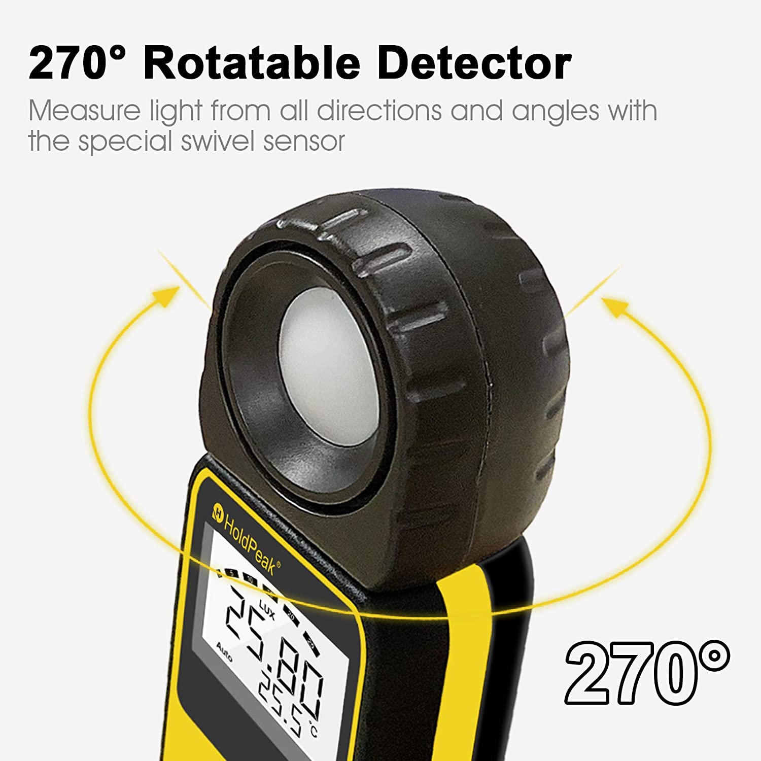 • ☀【270 Degree Rotatable Detector】Keep an eye on the light level anywhere in the room;The light meter sensor can rotate 270 degrees, So you don't need to move the light meter,just need to rotate the degrees to measure the lights that you need.