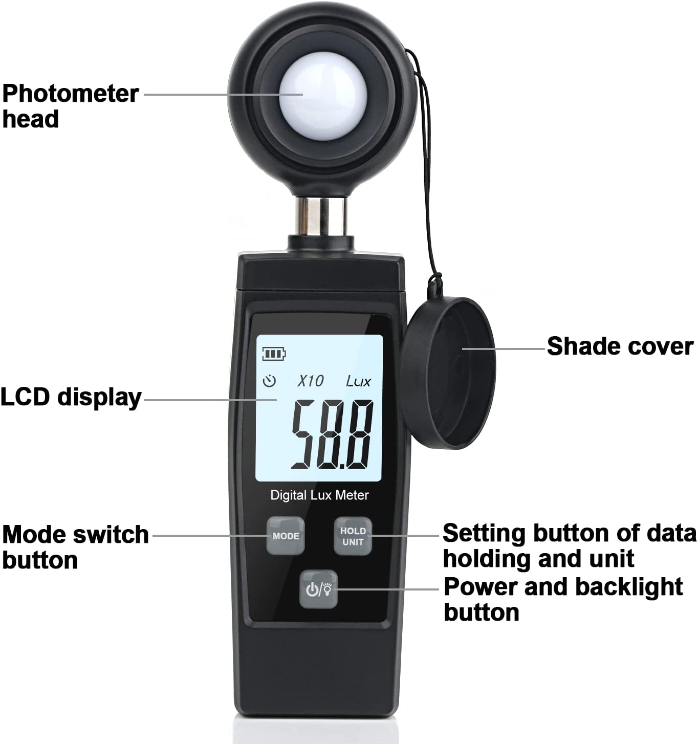 • 【HANDHELD】—You can bring the digital Illuminance / light meter wherever you need to. Fits easily into a work bag or large pocket and barely adds any weight. It's the ultimate in light-metering convenience!