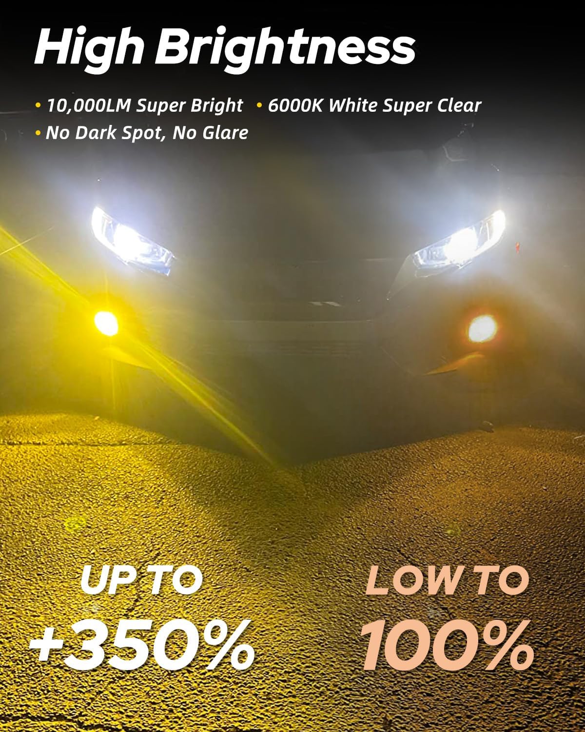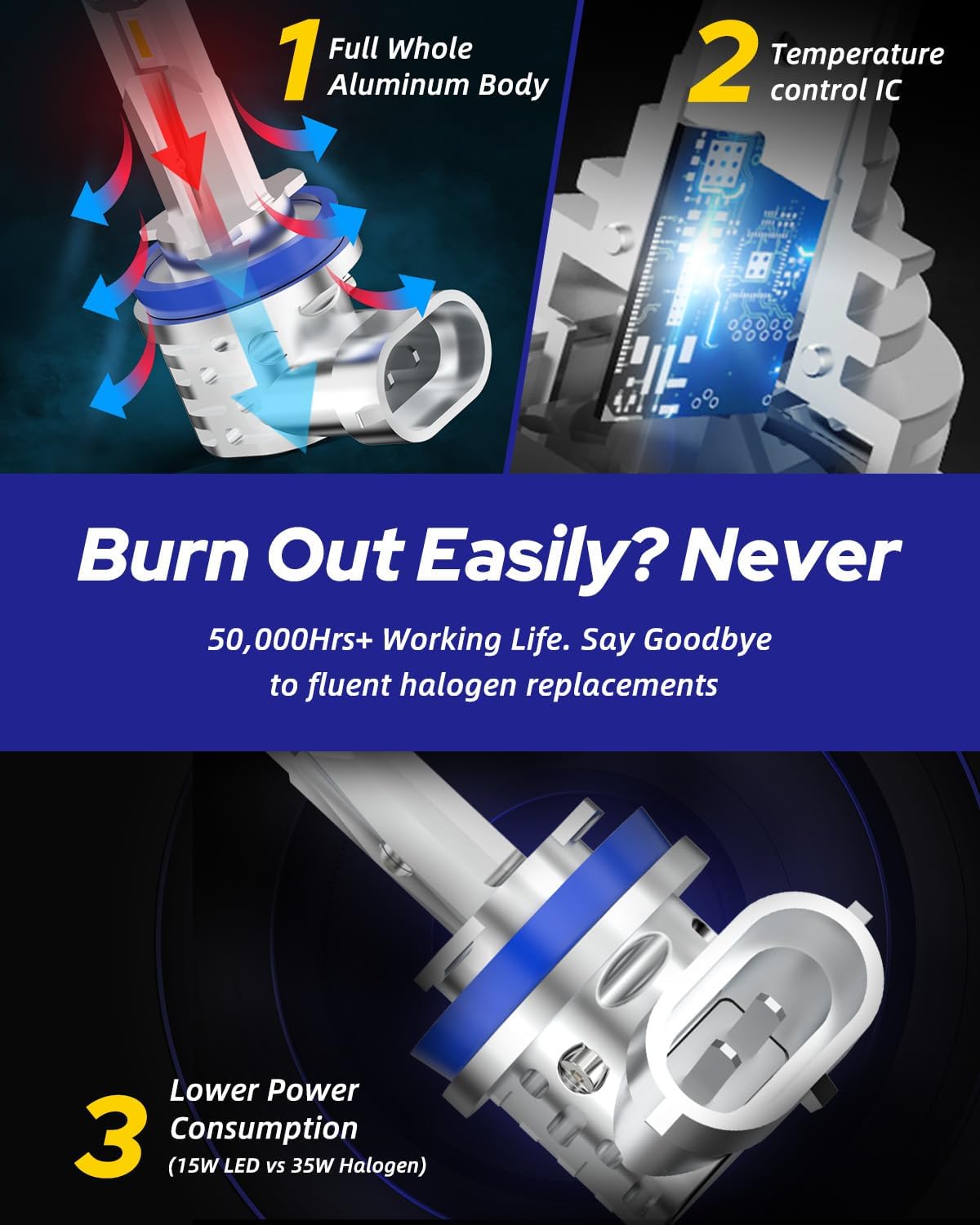 • 【50000+ Hours Lifespan】-Top-grade aviation aluminum heat sink design and intelligent temp control for heat dissipation ensure H8 LED fog lights much longer lifespan up to 50000 hours