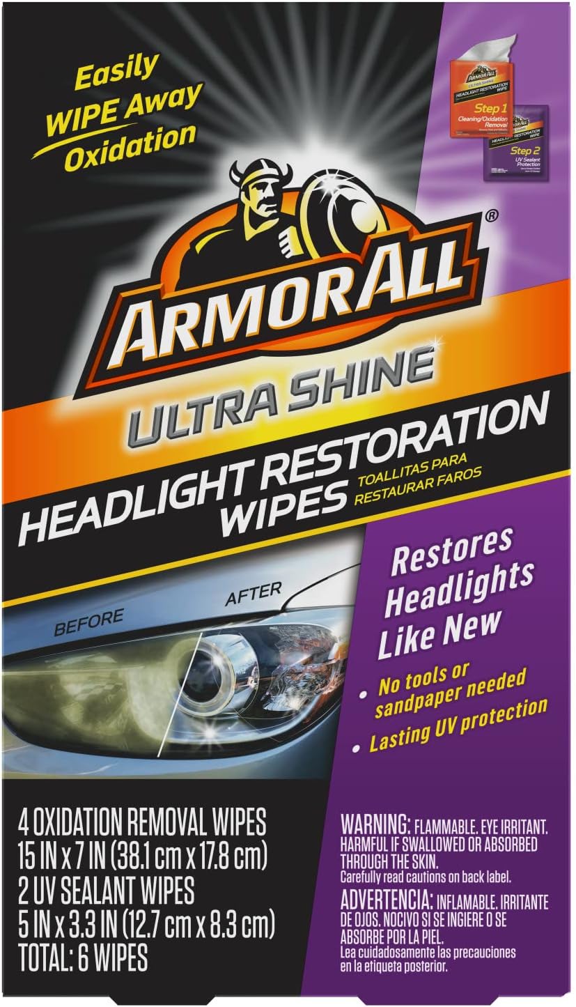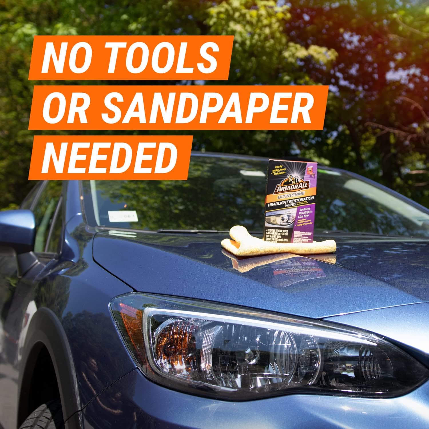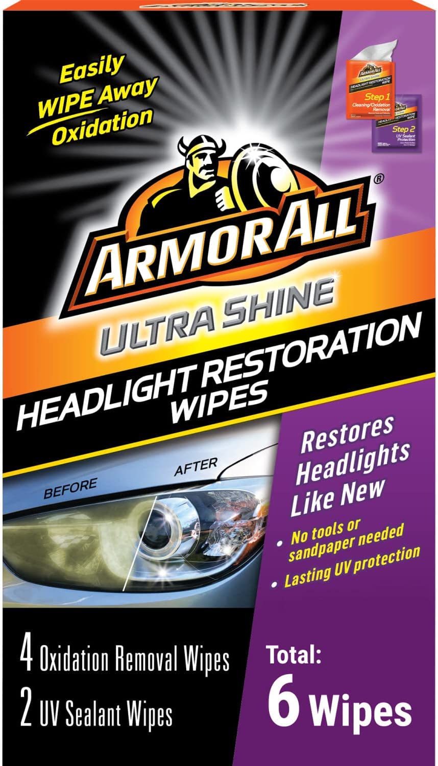 Armor All Ultra Shine Headlight Restoration Wipes easily wipe away oxidation, restoring your headlights like new in two easy steps. Pre-moistened wipes eliminate the guesswork out of how much to use, requires no tools or sandpaper, cures in about 3 hours, and provides lasting UV protection.