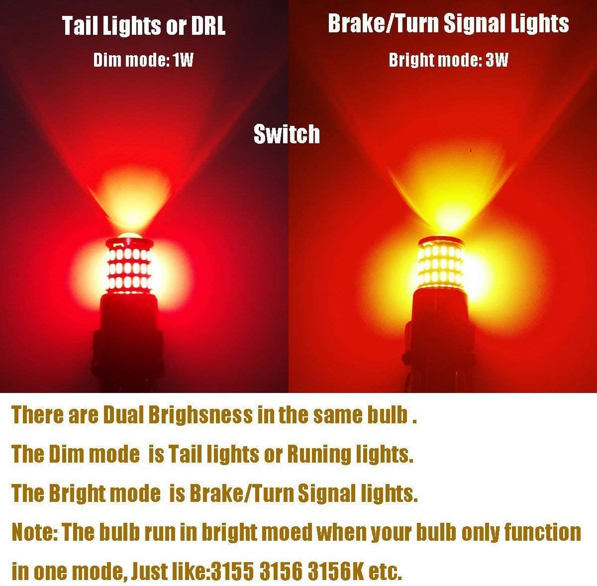Dual Brightness: The Dim mode is Tail lights or DRL, while the Bright mode is Brake lights or Turn Signal lights. The bulb run in Bright mode when your bulb only function in one mode.