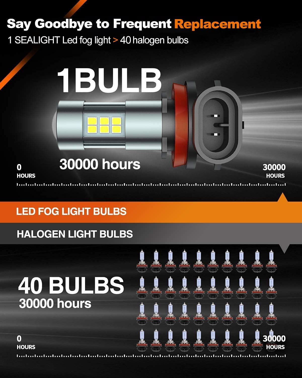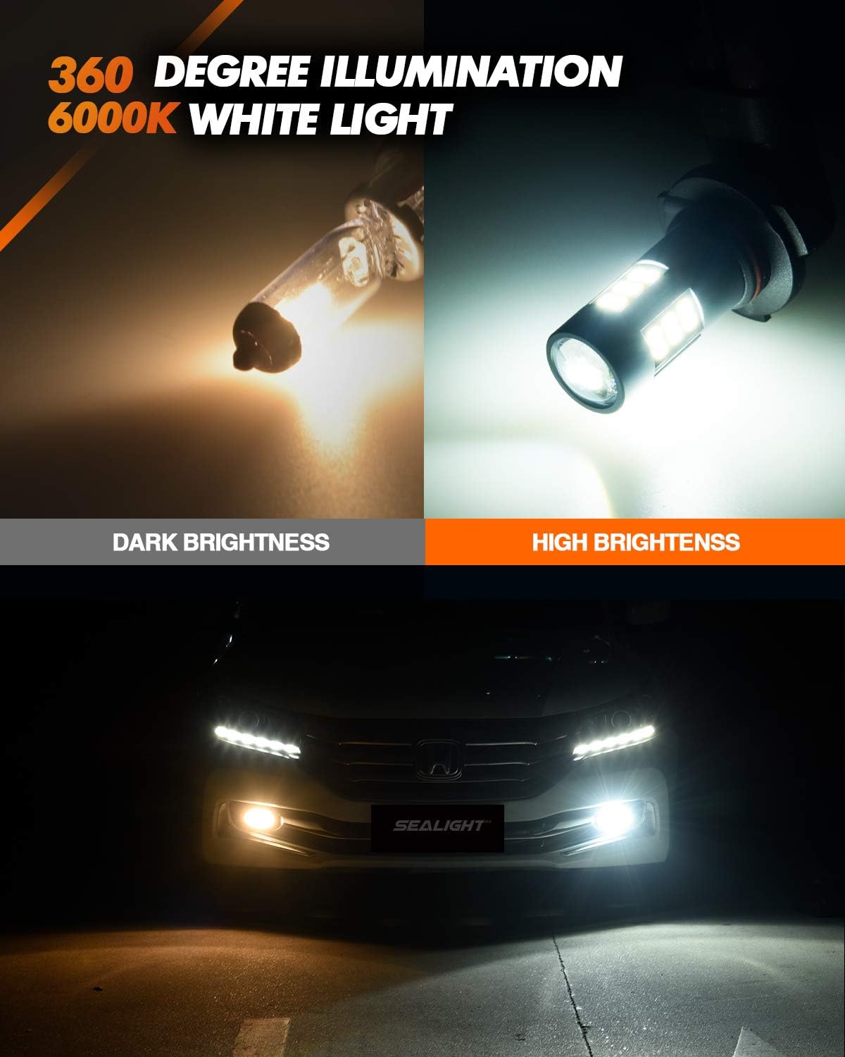 SEALIGHT H11/H8/H16 LED Fog Light Bulbs, 6000K Xenon White, 27 SMD Chips, 360-degree Illumination, Non-polarity, Pack of 2
