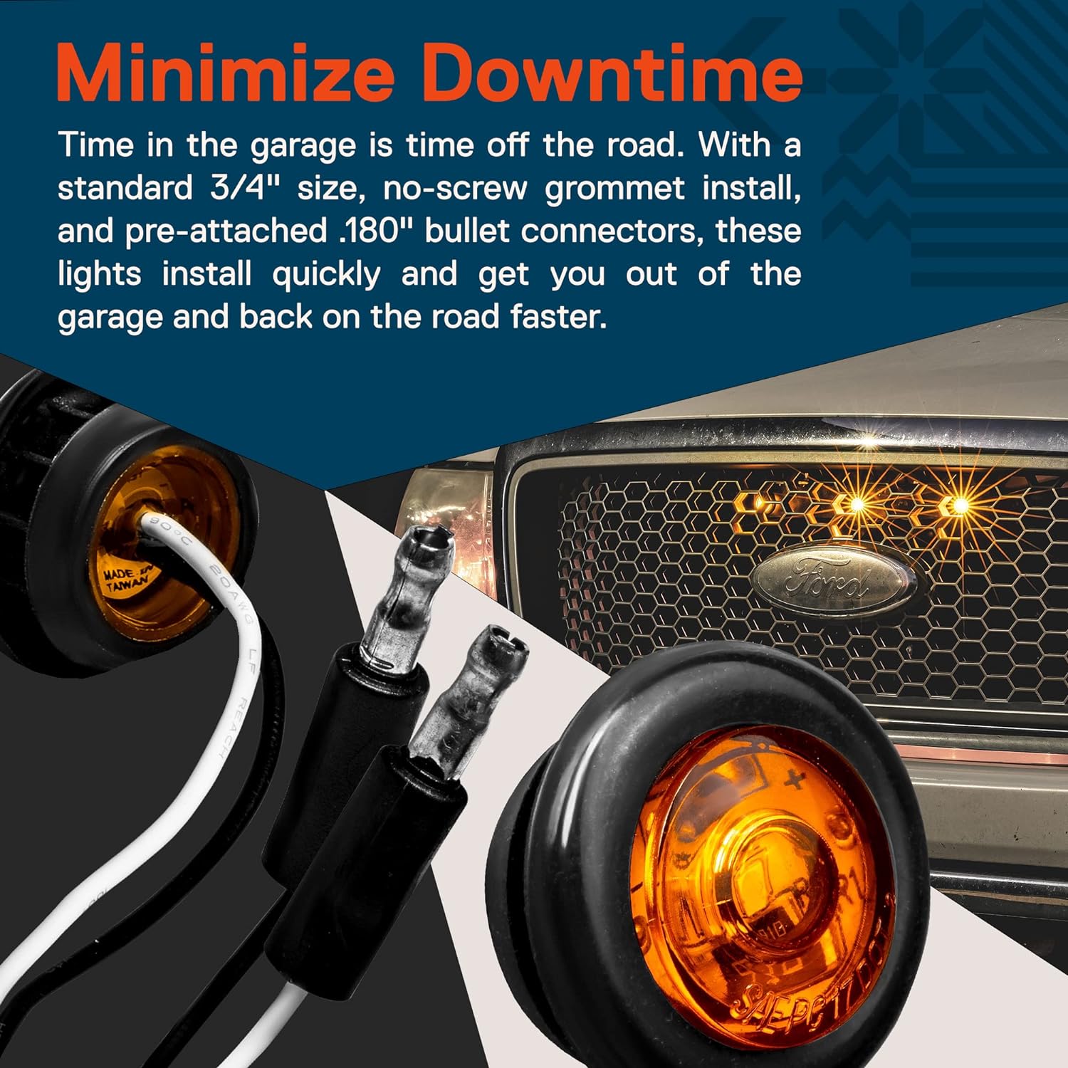 • QUICK INSTALL - Time in the garage is time off the road. With a standard 3/4" size, no-screw grommet install, and pre-attached .180" bullet connectors, these lights install quickly and get you out of the garage and back on the road faster.