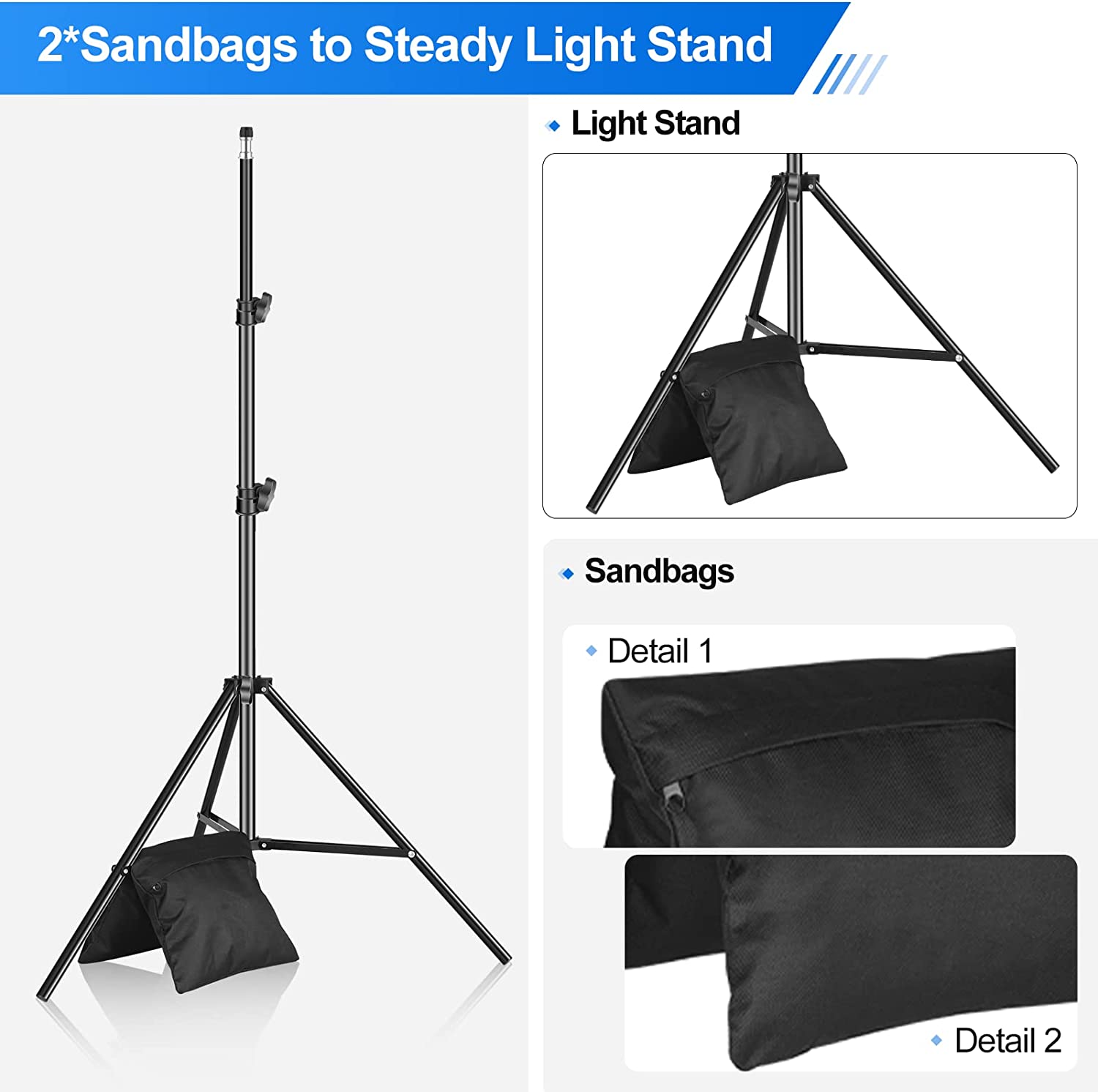 • [2 Sandbags]Foldable to 26.4 inch and extended to 83.9 inch adjustment light stand.This softbox Light Kit carries 2 sandbags to stabilize the light stand and solve the top-heavy problem of the lighting softbox kit.Each sandbag max rated for 25lbs and easy to carry.