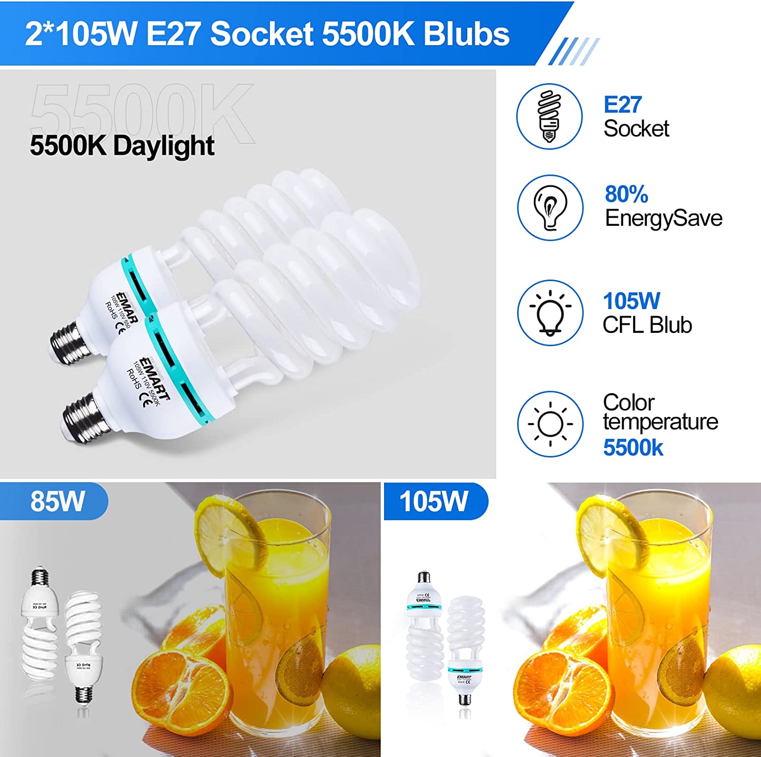• [2 Energy-saving bulbs]2 x 105W 110V-50Hz 5500K daylight CFL lighting bulb,the total output is equivalent to 1000W ordinary incandescent bulb,low operating temperature and longer life,CFLs will also help to make 80% savings on your energy bill.