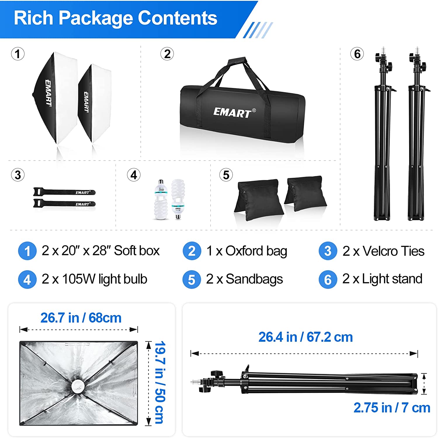 EMART Softbox Lighting Kit with Sandbag, 20"x28" Soft Box Lights Photography Accessories with 2x105W E27 5500K Bulbs , Professional Camera Light Kit for Studio Video Recording, Filming, Podcast