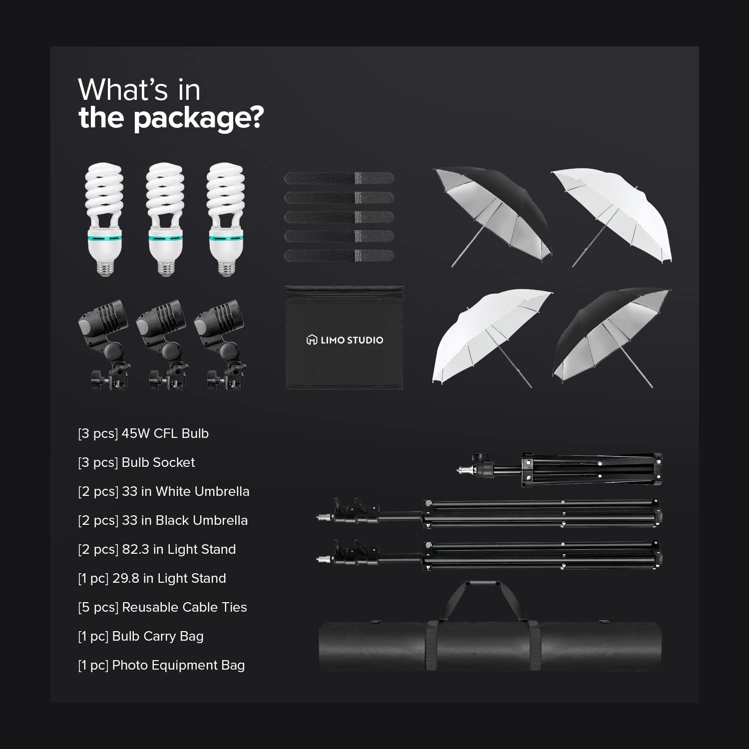 • ⭐Contents: [3 pcs] 45W CFL Bulb / [3 pcs] Bulb Socket / [2 pcs] White 33-inch Umbrella Reflector / [2 pcs] Black / Silver 33-inch Umbrella Reflector / [2 pcs] 82.3 inch Light Stand / [5 pcs] Reusable Fastening Cable Ties