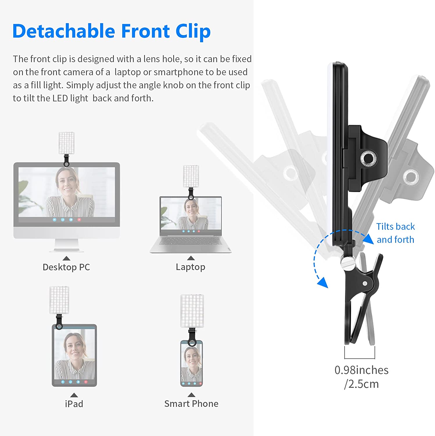 • 【Two Ways to Mount】 A circular clip attaches the light to your smartphone, tablet, laptop up to 0.7’ (18mm) thick and keeps the front camera uncovered. A phone holder fits smartphones 2”–3.3” (52–85mm) in width and installs the light on the back of the phone for use as a fill light. Two 1/4” screw holes directly mount the light on any light stand