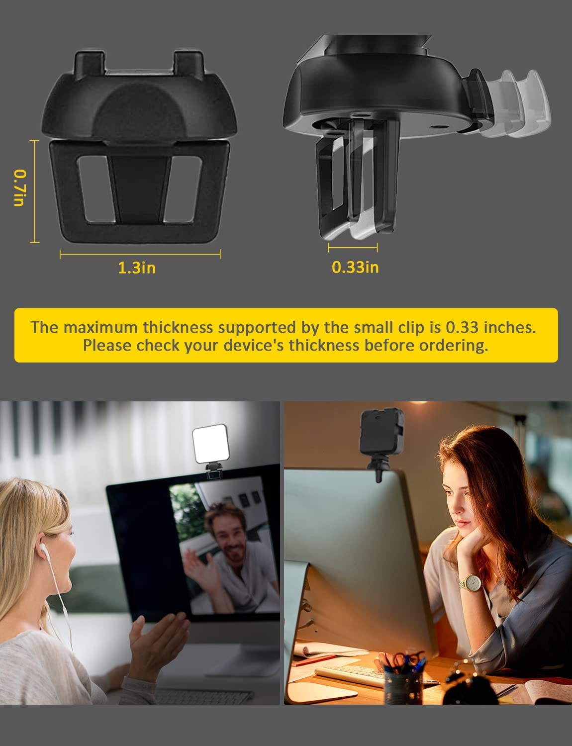 • 【Upgraded Flexible Clips】Upgraded webcam style mount allows the light to be firmly clipped onto a laptop, monitor, or any other flat/curved surface. The lightweight clip, which can rest easily without damaging your monitors, can work on screens as thin as 0.33 inches.