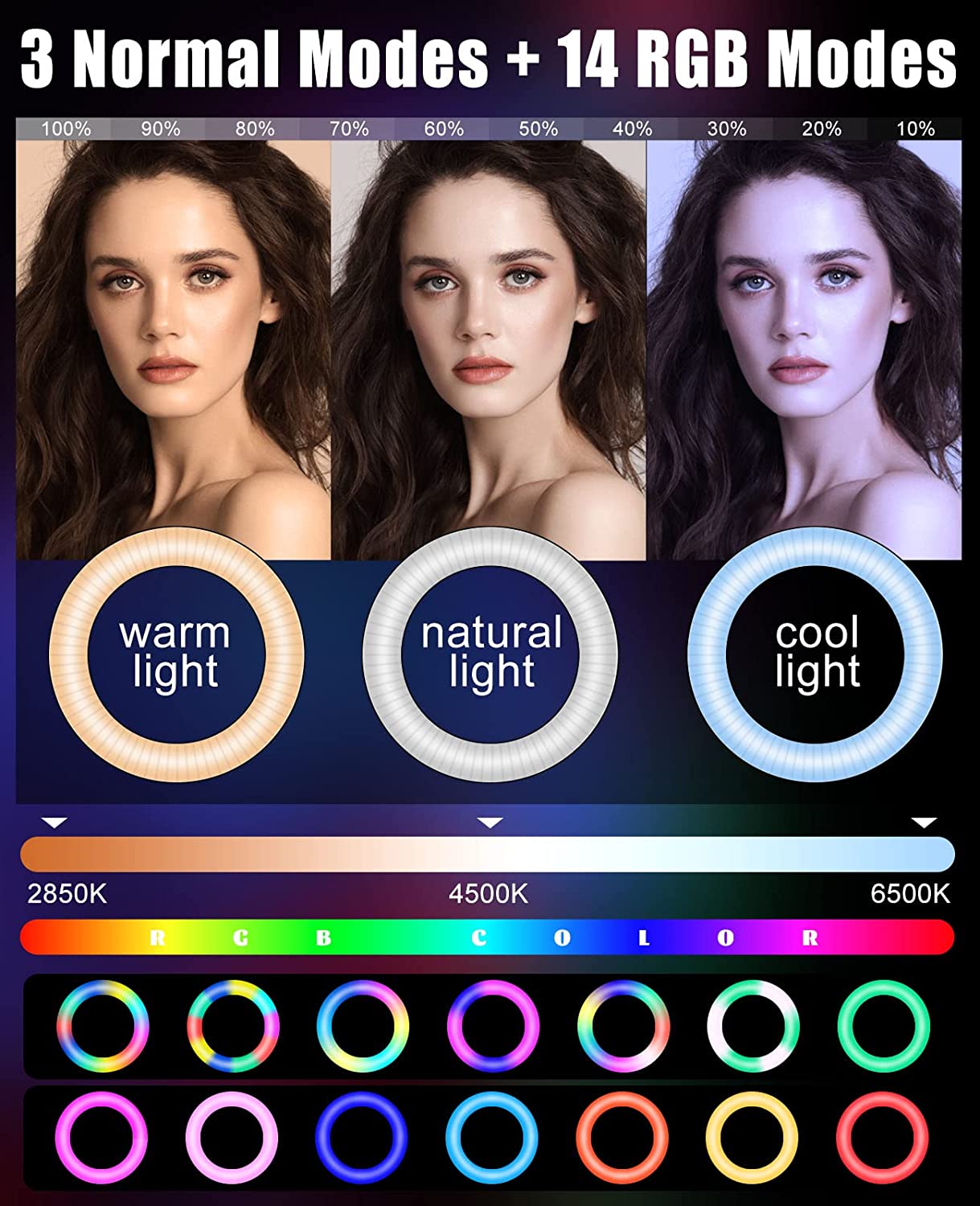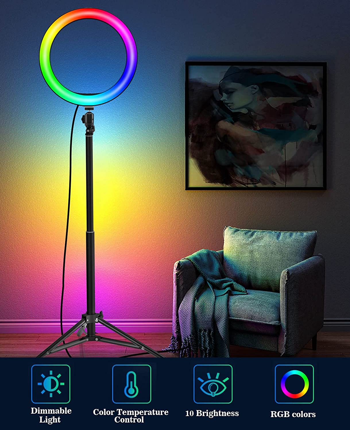 • ☀Dimmable Ring Light: The LED ring light is a Circle Light with a diameter of 10 inches. The ring light for iPhone has built-in 120 bright LED lights, and the LED ring light with stand has 3 color lighting modes (white, warm yellow, warm white), the color temperature is 2900K-5700K, each color lighting mode has 10 brightness adjustments for your choices, meet all your needs