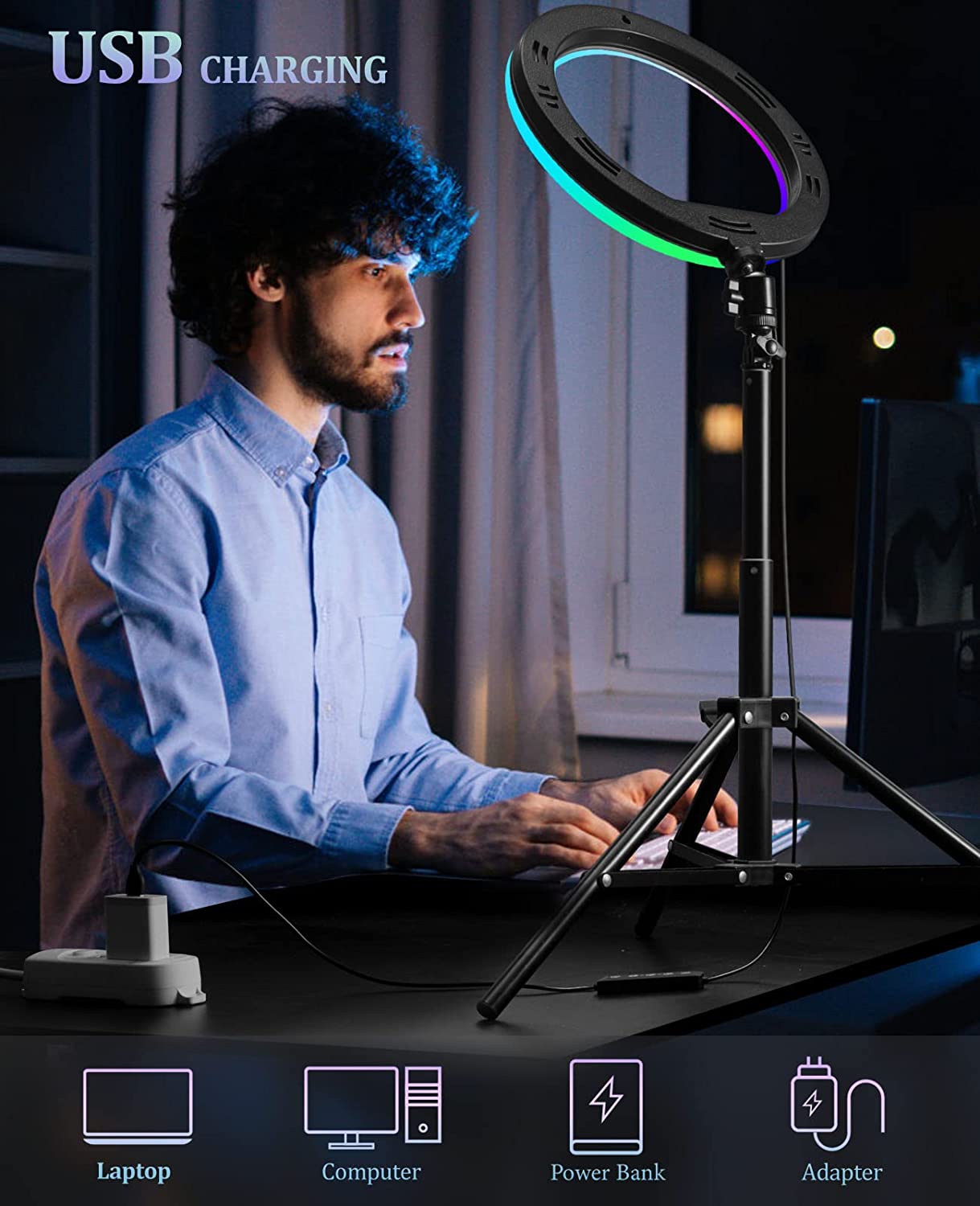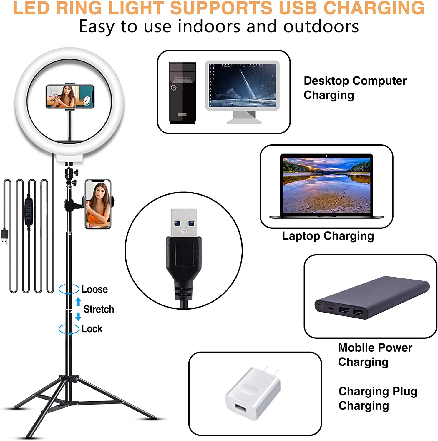• ☀Supports USB Charging: You can connect the USB charging cable that comes with the LED selfie ring light to the power bank, laptop, PC , USB charger and any device with a USB interface for charging. There are four buttons on the power cord of the ring light, which are used to turn on/off the power, switch the lighting mode and adjust the brightness level, as well as the Bluetooth Selfie remote control provided by us to make your use the ring light for iphone more convenient and faster