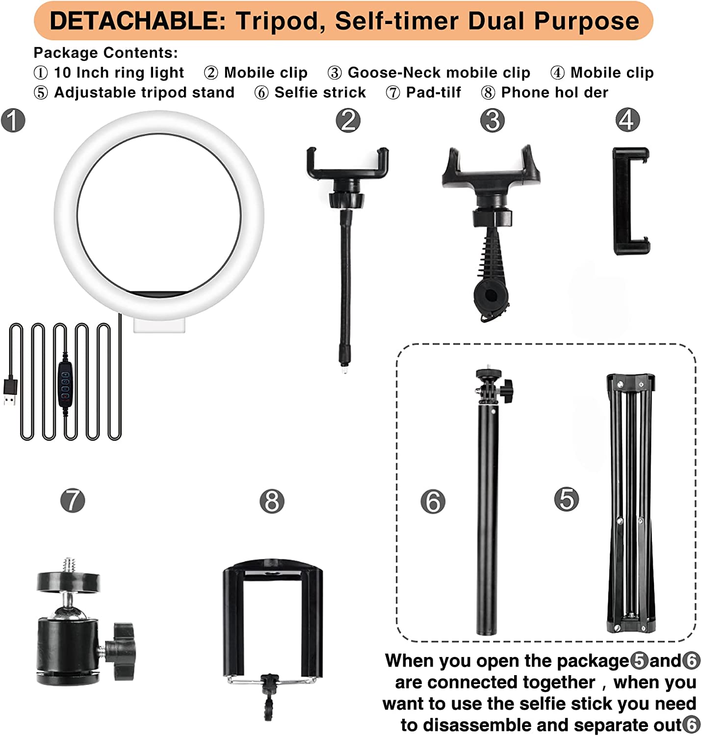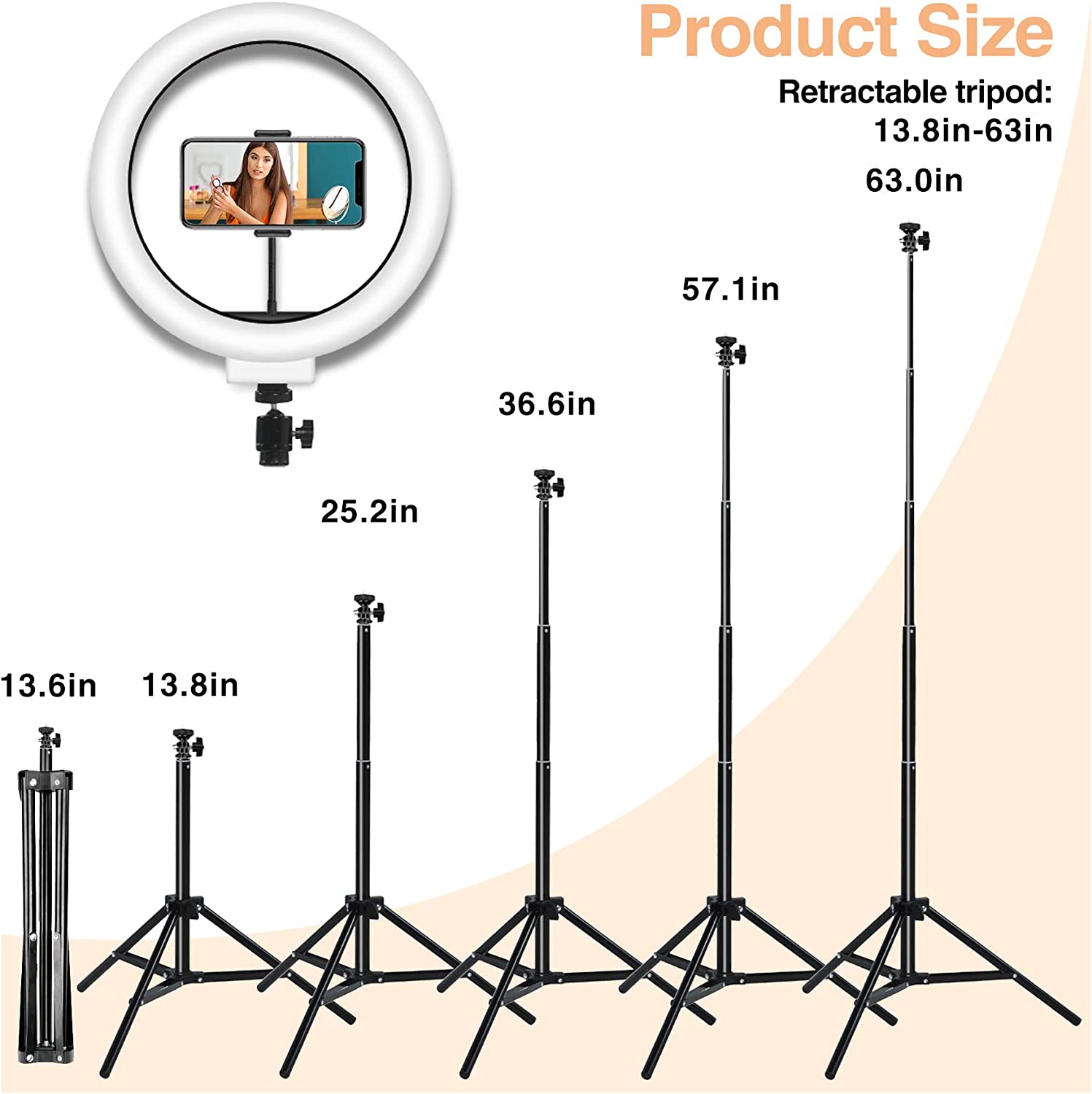• ☀Stable and Adjustable Tripod: The tripod with ring light is made of ABS and carbon steel to achieve better support. The bottom of the tripod can be extended to 19.3 inches, which can provide better stability. The length of the ring light support rod can be extended from 13.8 inches to 63 inches. The LED ring light with adjustable tripod can meet your needs for any height. In addition, the tripod with ring light can also be used as a selfie stick and selfie phone tripod