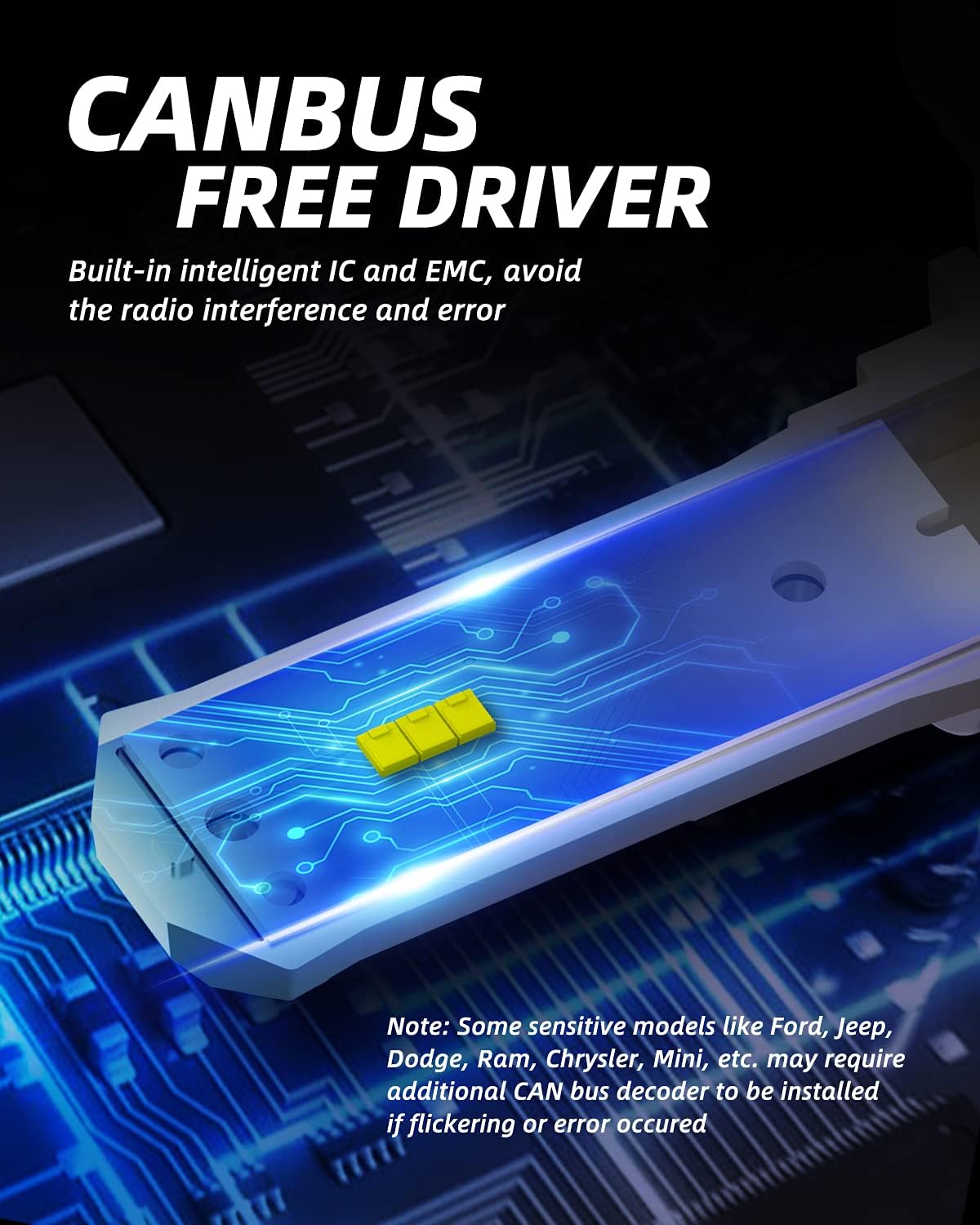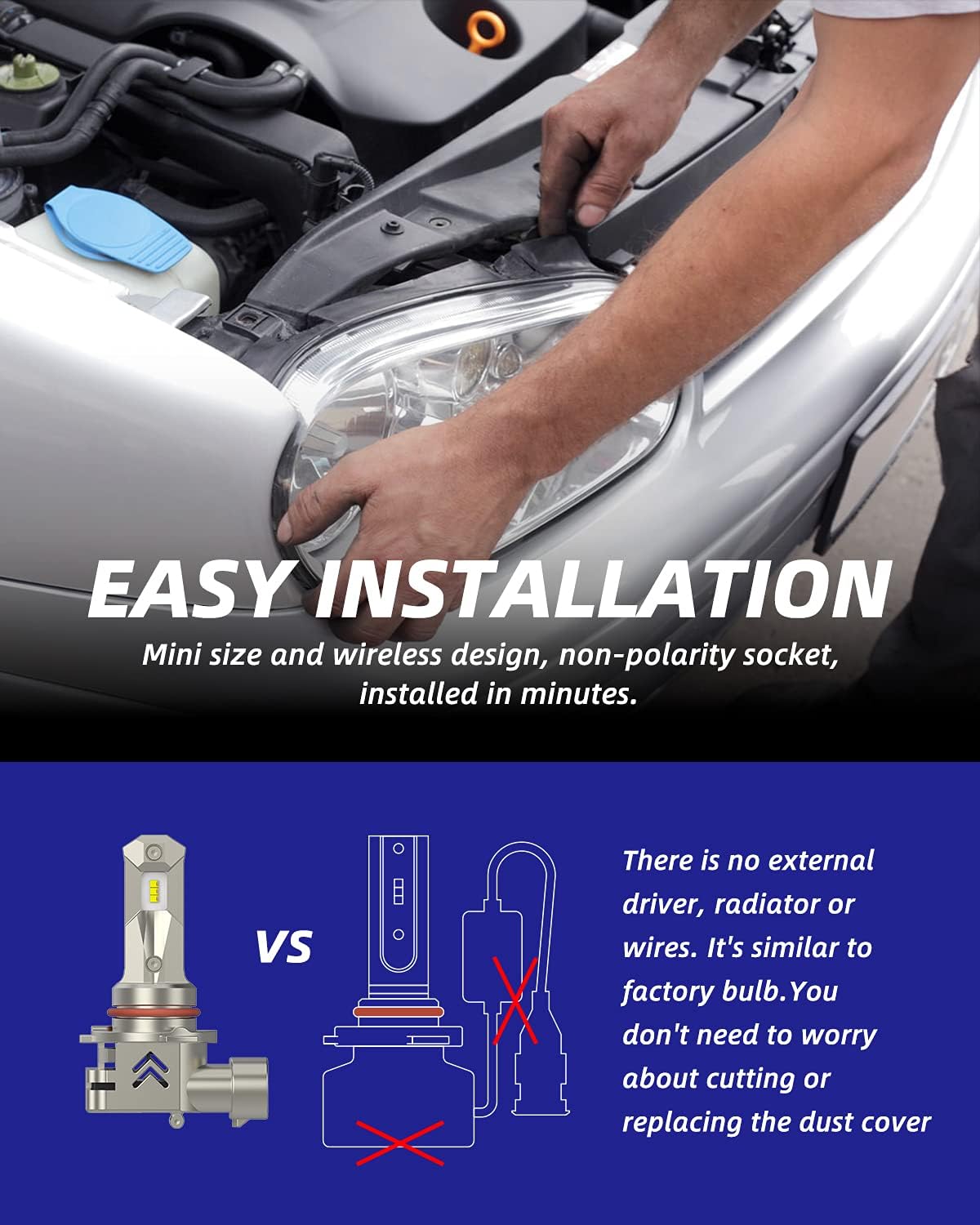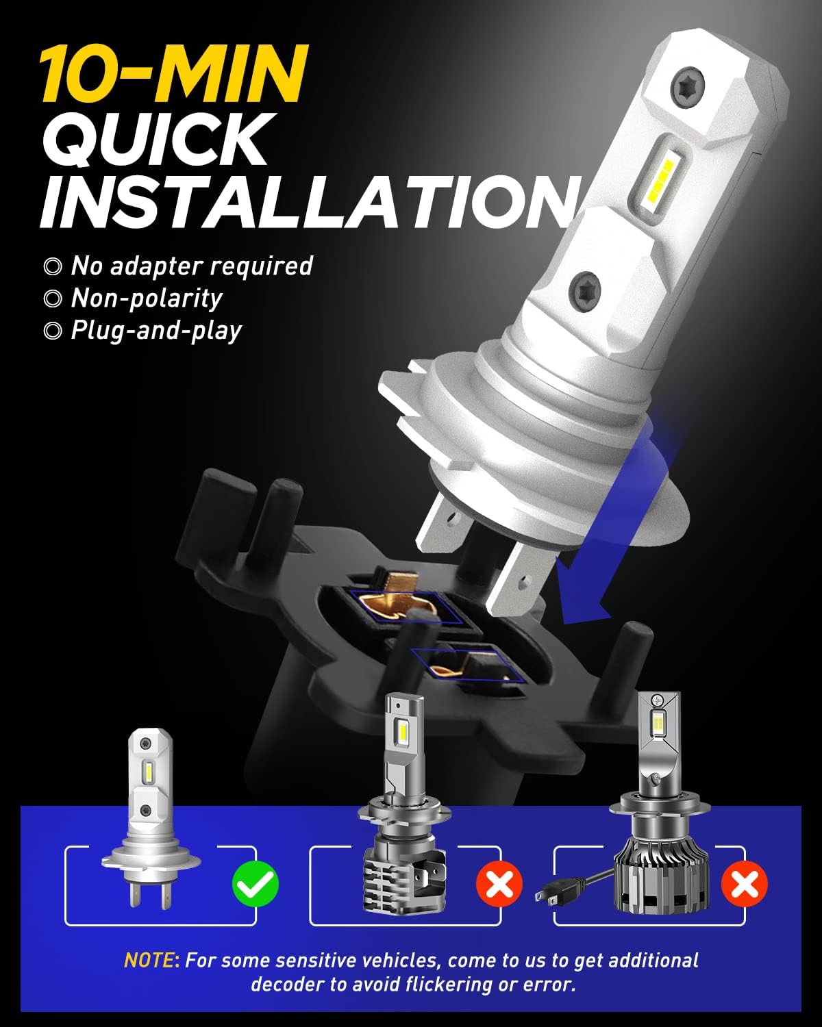 • EASY TO INSTALL: 1:1 mini size same as halogen h7 bulbs, no polarity real plug and play led bulb, no additional adapters needed, directly sit on your socket, stay away from all kinds of installation problems. NOTE: For some sensitive vehicles, come to us to get additional decoder to avoid flickering or error.