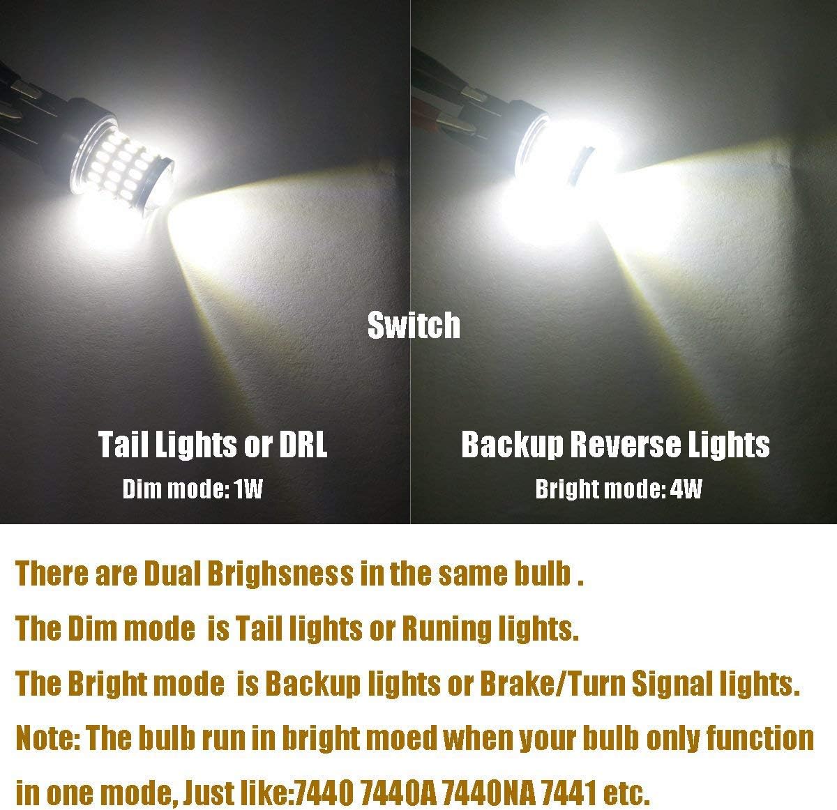 Dual Brightness: The Dim mode is Tail lights or DRL, while the Bright mode is Brake/Turn Signal lights or Back Up Reverse lights. The bulb run in Bright mode when your bulb only function in one mode.