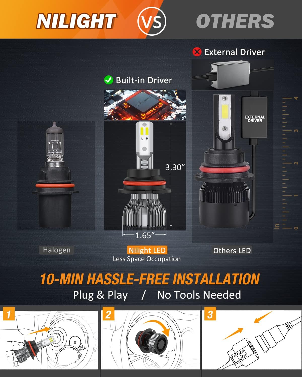 • 【10 Mins Easy Installation】 Bulid-in driver and non-polarity plug for taking up less space in housing, 1:1 mini size as original halogen bulbs for higher compatibility, real plug and play, quick install in 10 mins. H11 LED headlight kit smoothly fits into vehicle's housing and factory sockets even with limited space in headlight housing, no retrofitment required, no radio interference