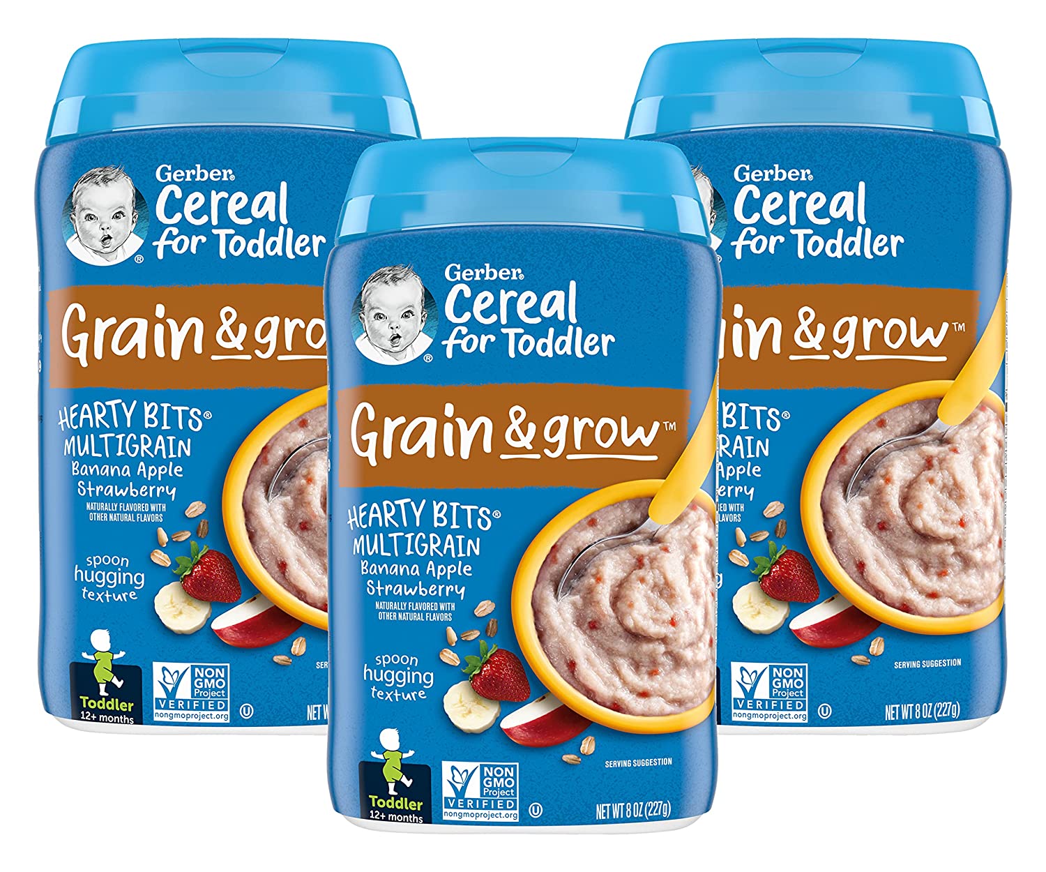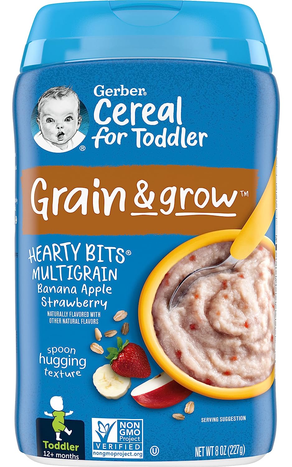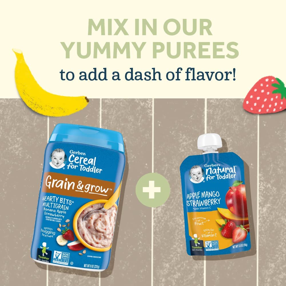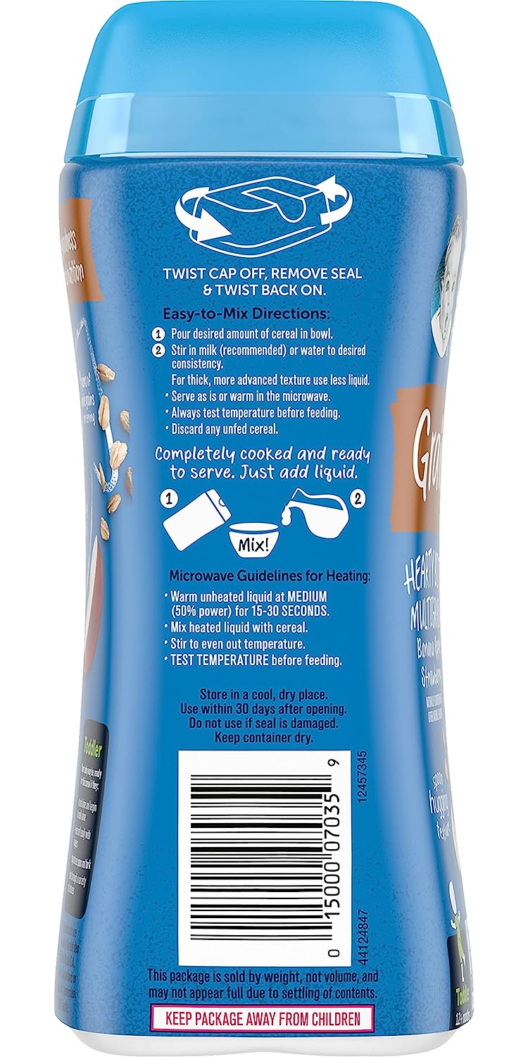 Gerber Hearty Bits cereal has a spoonable texture with a taste toddlers love. Our textured pieces and apple dices help toddlers practice chewing, while mixing to a spoon-hugging texture encourages toddlers to self-feed. Gerber Hearty Bits cereal is also an excellent source of iron for brain development and has a good source of Calcium and Vitamin D for healthy growth.