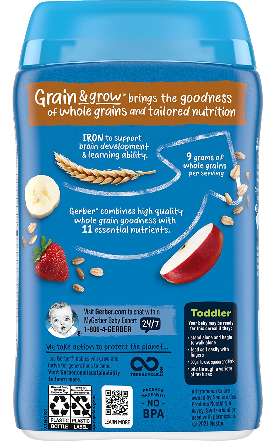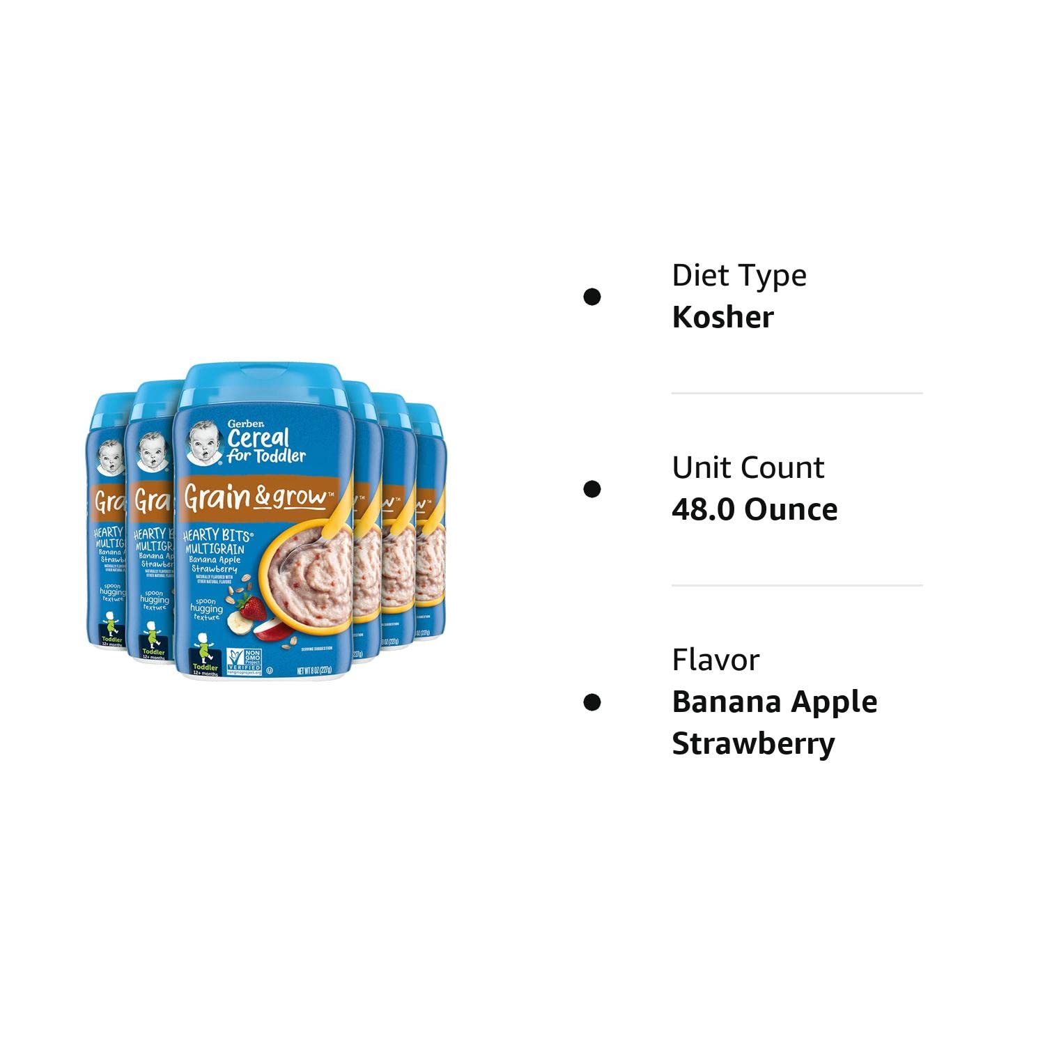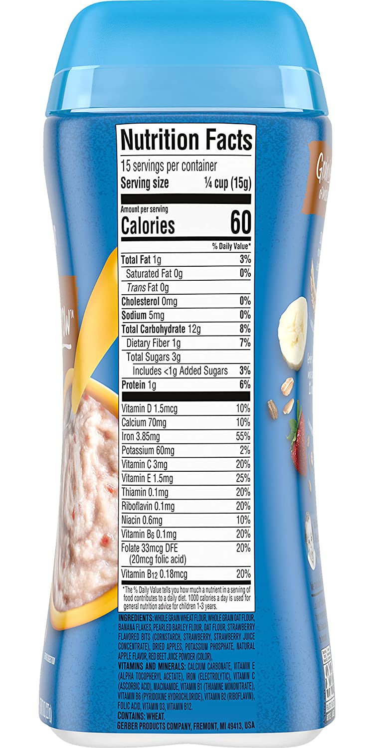 Gerber Hearty Bits cereal has a spoonable texture with a taste toddlers love. Our textured pieces and apple dices help toddlers practice chewing, while mixing to a spoon-hugging texture encourages toddlers to self-feed. Gerber Hearty Bits cereal is also an excellent source of iron for brain development and has a good source of Calcium and Vitamin D for healthy growth.