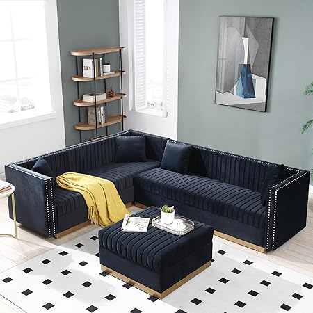 3PCS Contemporary Vertical Channel Velvet Tufted Living Room Furniture Sets, Modern Luxury Corner Sofa with Nailhead Trim, 4 Pillows, 3 Seater Sofa Couch Velvet Sofa Set for Living Room Black