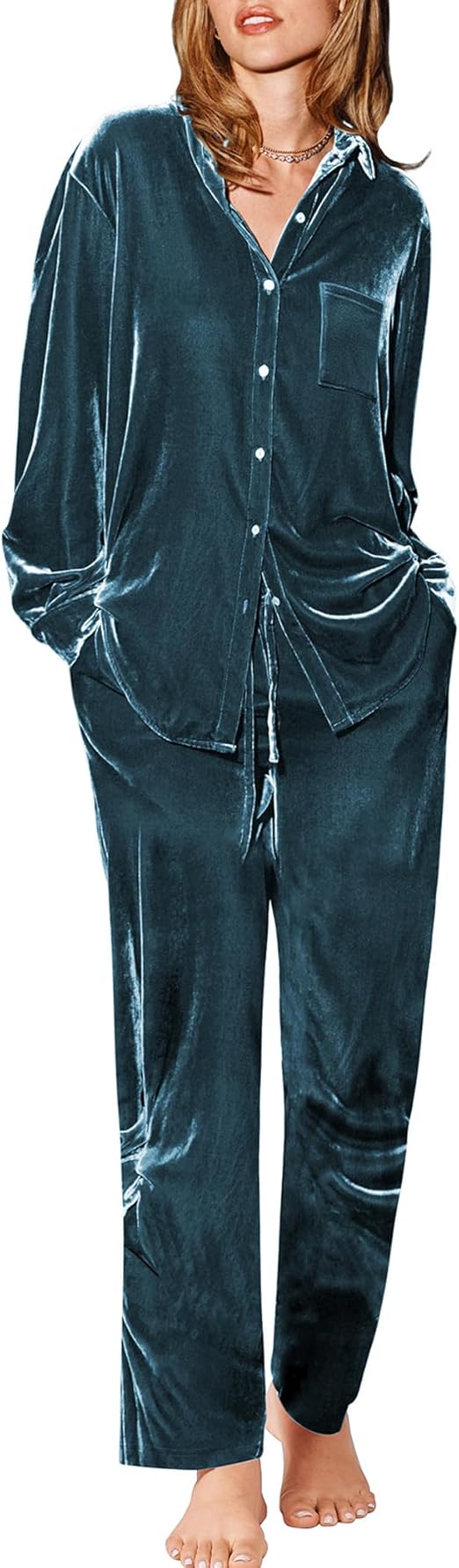 Ekouaer Womens Velvet Pajamas Set Long Sleeve Button Up Sleepwear Soft 2 Piece Loungewear Pj Set