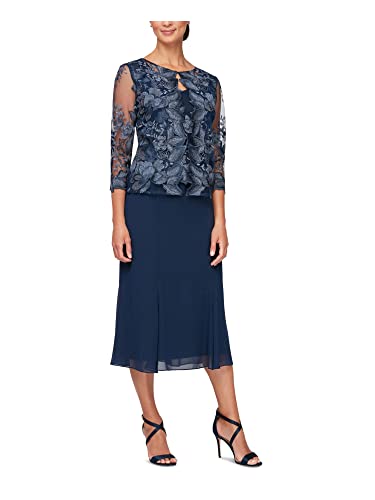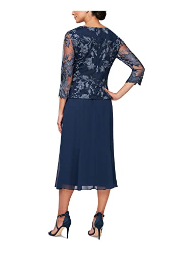 Alex Evenings Women's Tea Length Mock Jacket Dress with Button Front, Navy Lace, 4