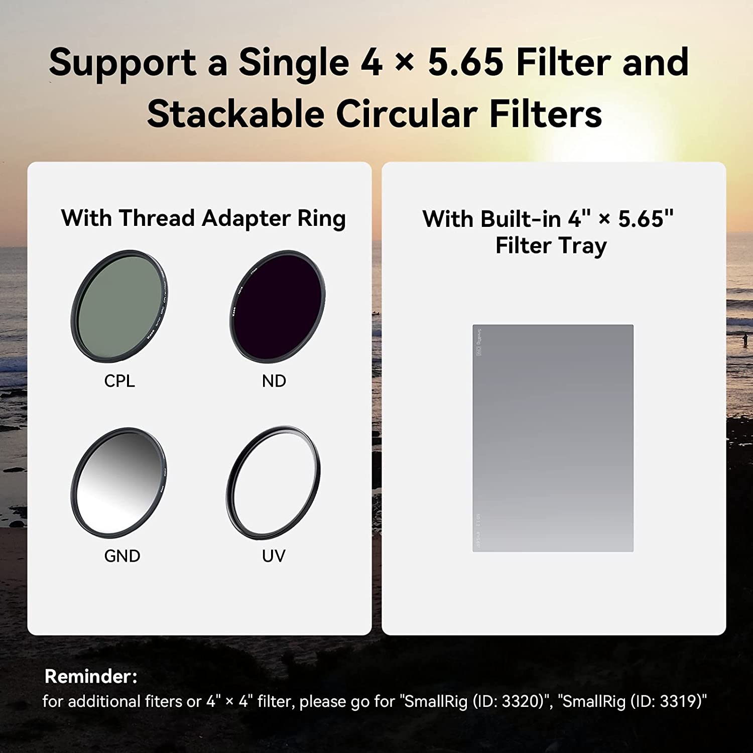 • 【WIDE COMPATIBILITY】SmallRig 3196 fits various standard lenses such as 4 x 5.65" and round filters. Its clamp connector works with different adapter rings (optional model 3383 : Φ52-95mm; Φ55-95mm; Φ58-95mm; Φ62-95mm; Φ86-95mm, standard rings: Φ67-95mm; Φ72-95mm; Φ77-95mm; Φ82-95mm;) or attached directly to Φ95mm lens; its adapter ring fits round CPL, ND filter and other round filters of up to Φ92.5mm. Besides, it leaves enough space for quick disassembly and adjustment of the round filter.