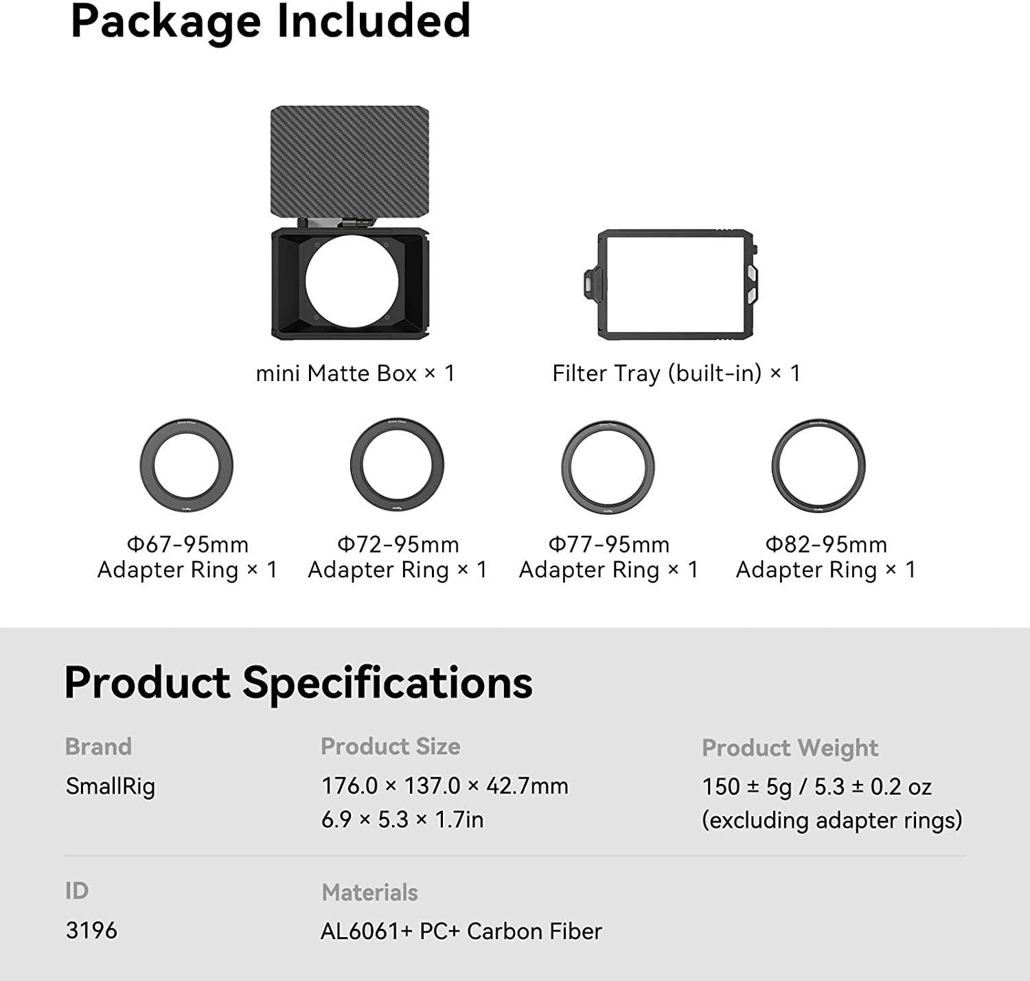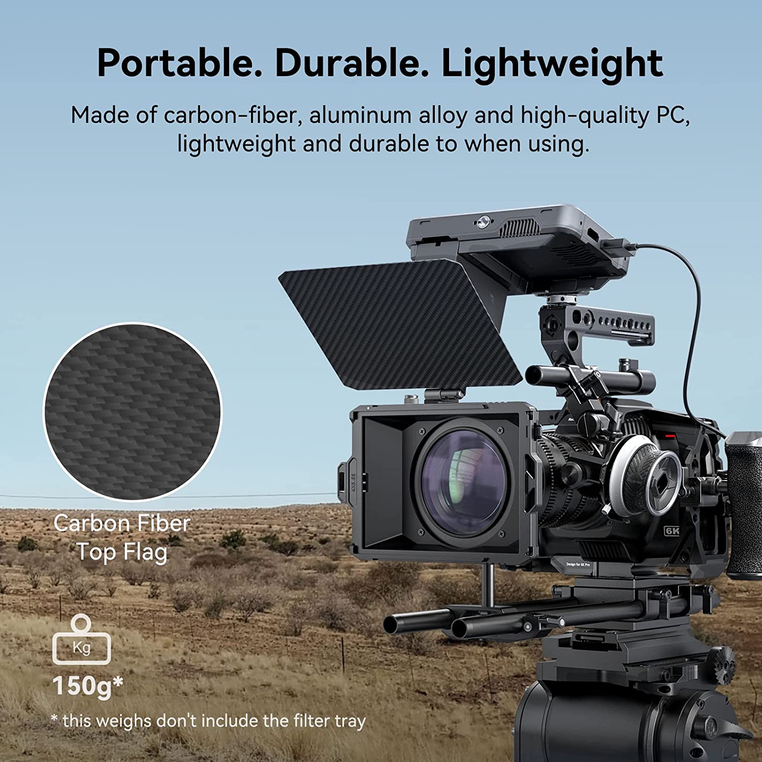 • 【PORTABLE & COMPACT】The Mini Matte Box 3196 is made from durable but super lightweight carbon fiber material. Portable and compact, with only 125g(without adapter rings). It meets users' common shooting needs and easy for carrying outside.