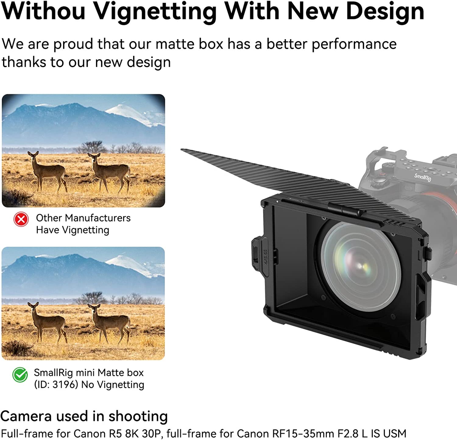 • 【CARBON FIBER BOX & TOP FLAG】SmallRig Mini Matte Box 3196 is designed for DSLR and mirrorless cameras to prevent sunlight or other light from causing glare and flare and to control the image on the screen. The adjustable carbon-fiber top flag blocks sunlight or strong light and also prevents internal reflections with its anti-reflective design. Moreover, it avoids vignetting in 15mm focal length shooting. (If you need a top & side flag, pls search "SmallRig 3597")