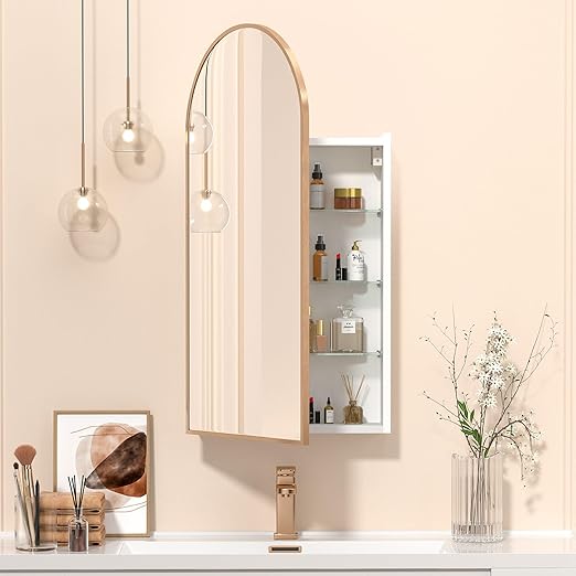 Gold Bathroom Medicine Cabinets, Arched Medicine Cabinet with Mirror, Arch Mirror Medicine Cabinet Wall Mounted, with 3 Adjustable Shelves, 16x31 Inch