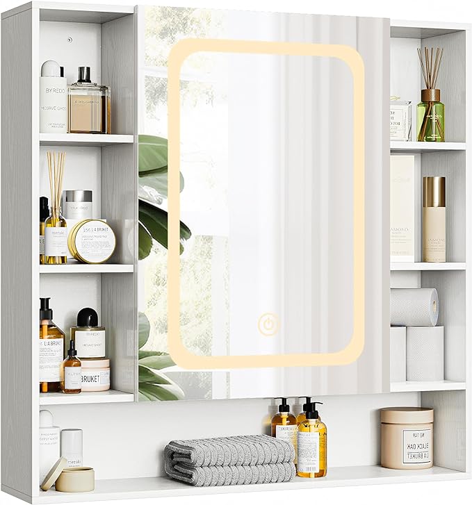 IRONCK Medicine Cabinets Wall Mounted with LED Light Mirror, Bathroom Wall Cabinet with Shelves for Bathroom Storage, Lighted Medicine Cabinet, White