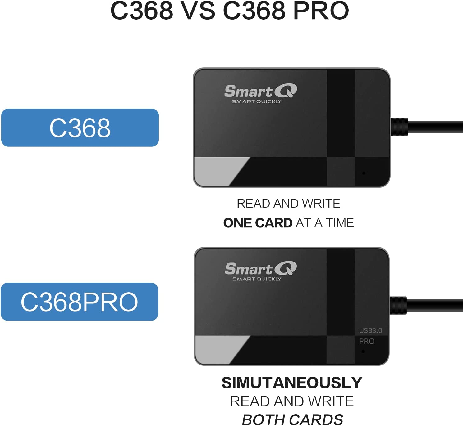 Work smarter and faster with C368 Pro. This card reader is perfect to transfer files from your phone, camera, GoPro digital memory cards to your PC and vice versa. Simply connect to an available USB port and Go! You will be able to transfer and manage your files quickly and easily, including large files, saving you tons of time in a busy world. You won’t need to sit around and wait with USB 3.0, including data transfer rates Super-Speed (5Gpbs), High-Speed (480Mbps), Full-Speed (12Mbps).