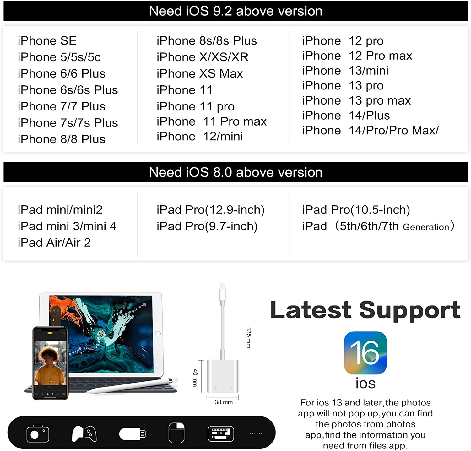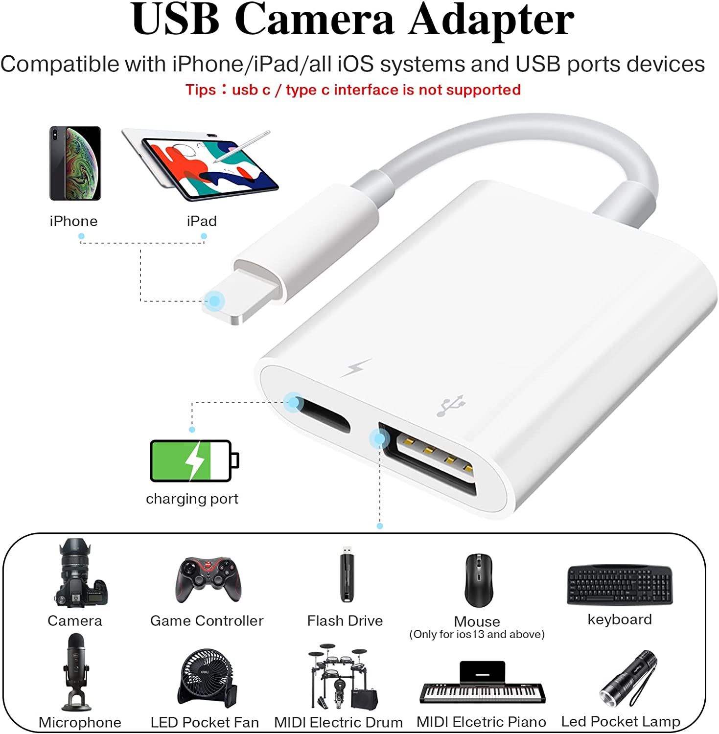 • With iOS Charging Port: This usb adapter adds a charging port, charging,view photos or videos can be operated at the same time.don't worry about the power shortage of your phone anymore.more importantly, this usb to adapter for iphone can also allow you to share battery power with your friends and solve your friends' urgent needs.