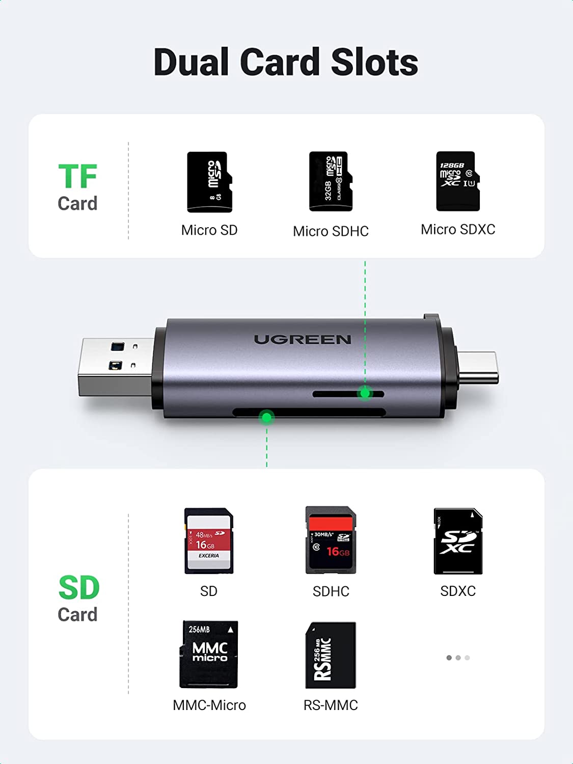 • Universal Compatibility: Applicable for SD/SDHC/SDXC/MMC/RS-MMC/Micro SD/Micro SDHC/Micro SDXC/UHS-I memory cards up to 2TB.