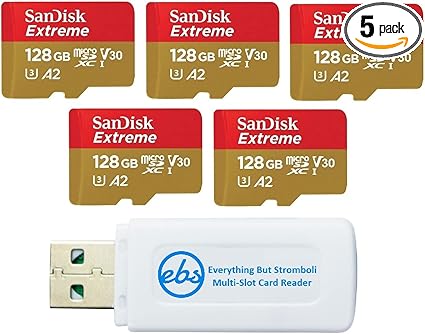 SanDisk 128GB Extreme MicroSD (5 Pack) Memory Card for DJI FPV Drone (SDSQXAA-128G-GN6MN) Class 10 4K V30 UHS-I U3 A2 SDXC Bundle with (1) Everything But Stromboli MicroSD and SD Card Reader