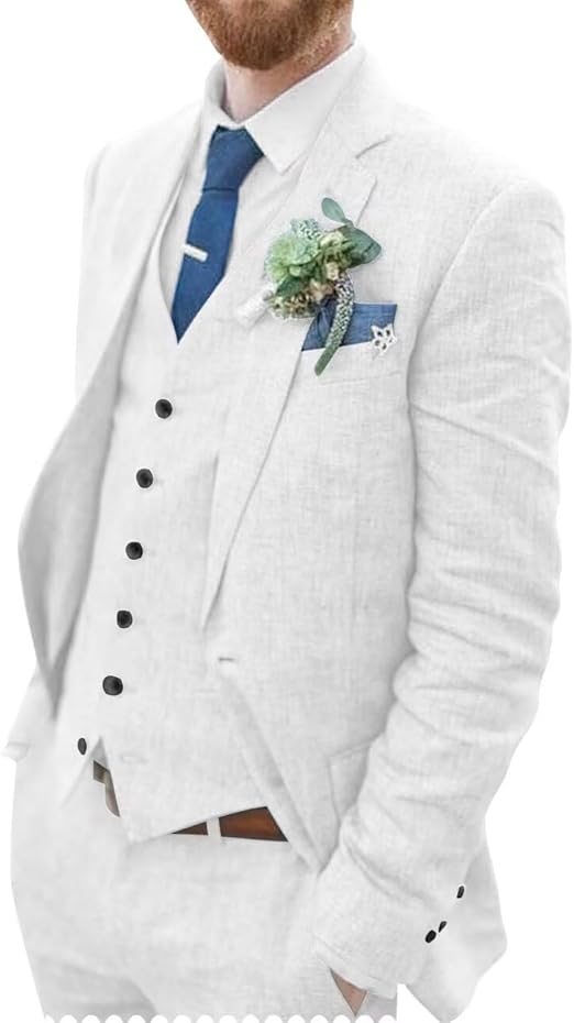 Wangyue Men's Linen Suit 3 Piece Suit Slim Fit Two Buttons Casual Suits Summer Beach Wedding Suits Set