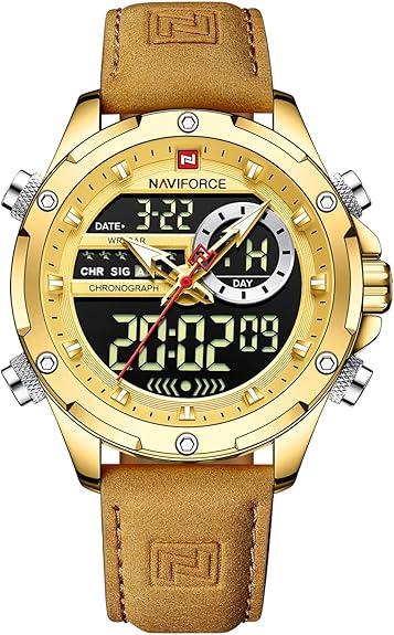 NAVIFORCE Men's Military Digital Watches Japanese Quartz Movement Analog Quartz Waterproof Watch Sport Multifunctional Leather Wristwatch (Gold)