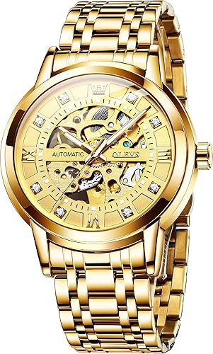 OLEVS Gold Skeleton Men's Automatic Mechanical Watches self Winding Luxury Dress Shiny Diamond Stainless Steel Waterproof Luminous Wrist Watches