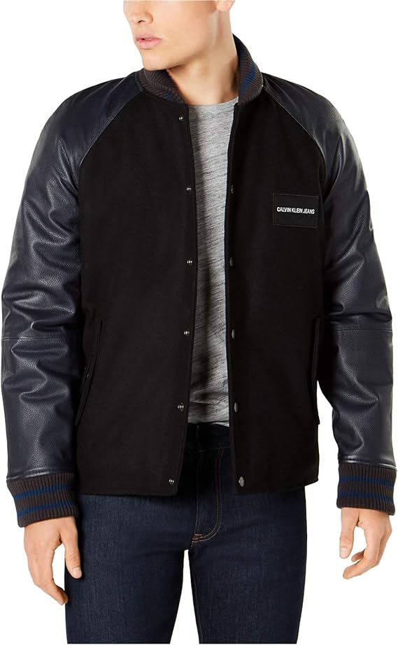 Calvin Klein Mens Leather Sleeve Varsity Jacket, Black, Small