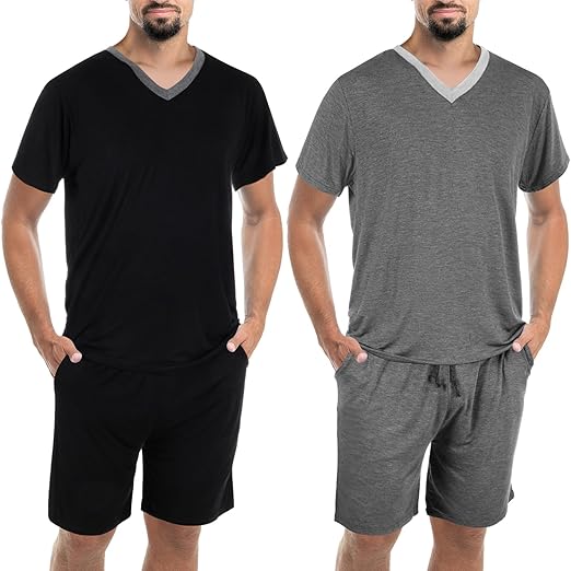 2 Sets Men's V Neck Pajamas Summer Pjs Set Soft Modal Nightwear Short Sleeve and Shorts with Pocket Comfy Sleepwear