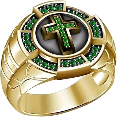 Cross Emerald Ring for Men 10K/ 14K/ 18K Solid Real Yellow Gold Ring for Men Handmade Cross Luxury Men's Ring with Emerald Gemstone Engagement Wedding Ring Promise Ring Gifts for Him Dad Menäó»s Jewelry Size 4-18