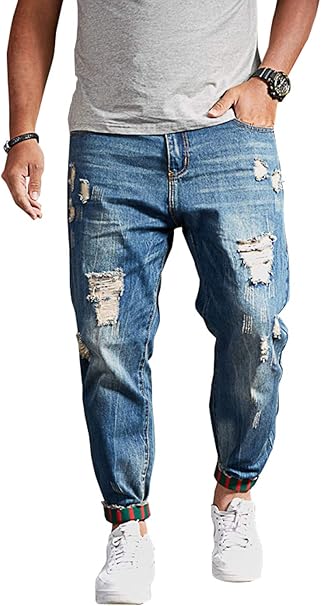 chouyatou Men's Casual Distressed Style Tapered Leg Harem Jogger Jeans Crop Denim Pants