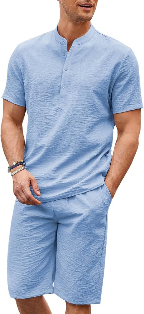 COOFANDY Men's 2 Pieces Linen Set Casual Henley Shirts Short Sleeve Beach Yoga Shorts Summer Pants Outfits