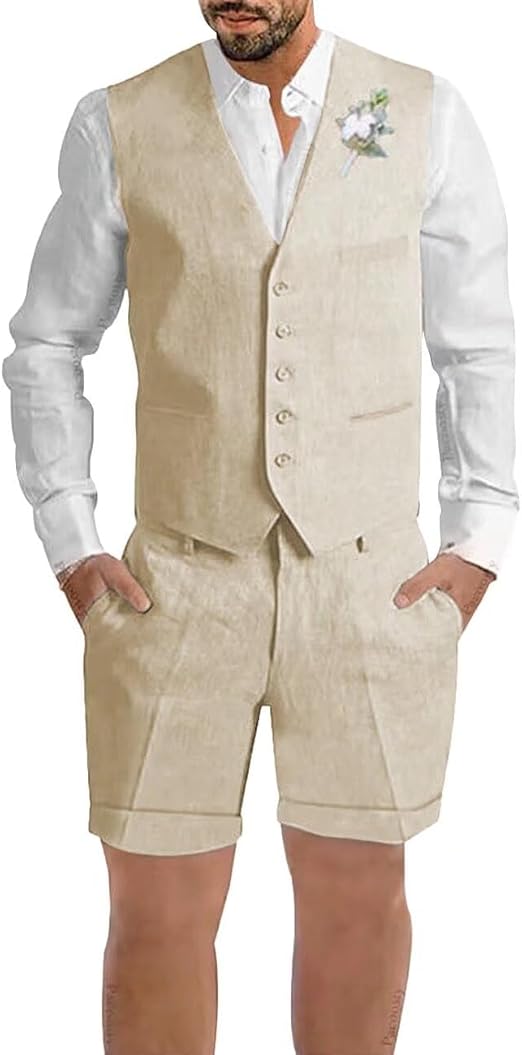 Men's Linen Suit 2 Piece Slim Fit Vest and Shorts Set Summer Casual Lightweight Groomsmen Beach Wedding Suits