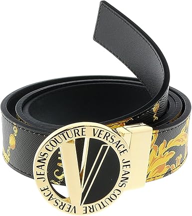 VERSACE JEANS COUTURE Black/Gold V-Emblem Cut Out Buckle Chain Print Belt- for Mens