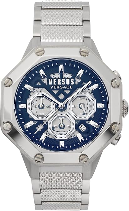 Versus Versace Collection Luxury Mens Watch Timepiece with a Silver Bracelet Featuring a Silver Case and Blue Dial