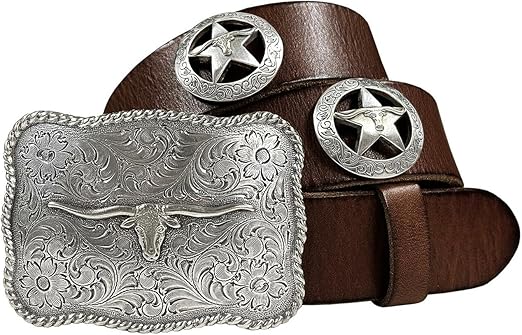 Antique Silver& Gold Longhorn Buckle Conchos Belt Genuine Full Grain Leather Belt 1-1/2"(38mm) Wide