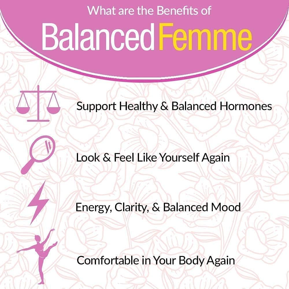 • KICK MENOPAUSE TO THE CURB! Menopause and PMS are stressful and uncomfortable for millions of women. Balanced Femme uses six powerful, natural herbs to help the body balance its hormones during these uncomfortable times: Vitex, Dong Quai, Black Cohosh, Wild Yam, Maca Root, and Red Raspberry Leaf.