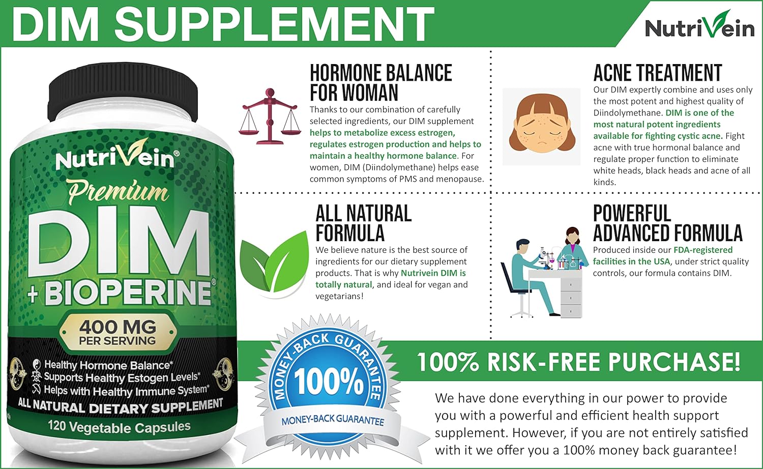 Nutrivein DIM Supplement 400mg Diindolylmethane Plus Bioperine - Maintain Hormone Balance with Estrogen for Menopause and Middle Age - Supports Acne and PCOS Treatment Men & Women