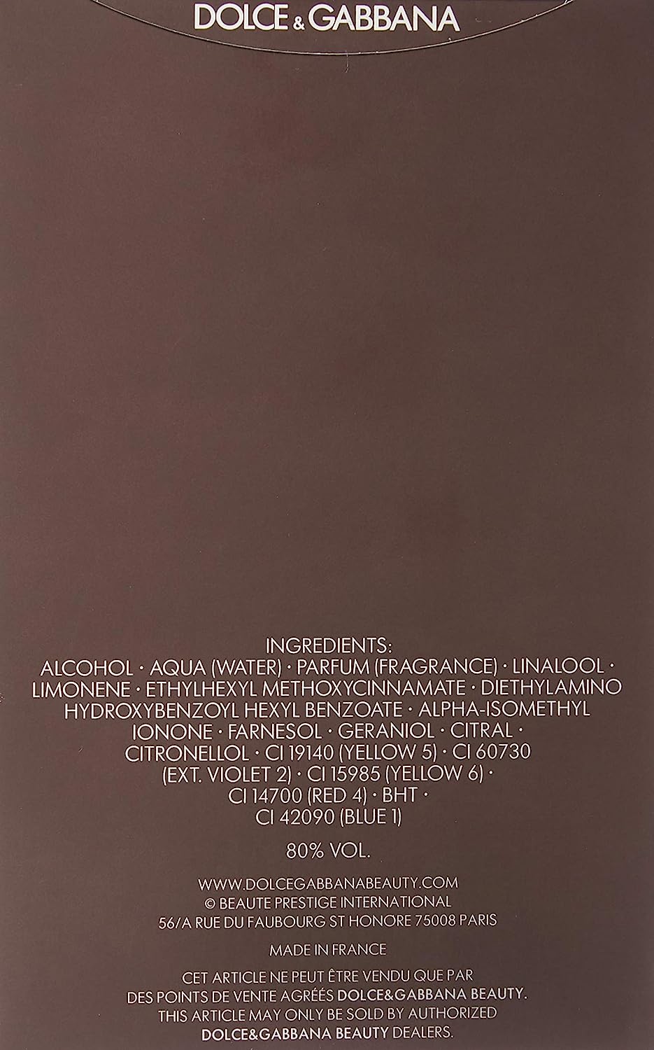 Dolce and Gabbana The One EDT for Men, 3.3 oz. Ingredients: Alcohol Denat., Parfum/Fragrance, Water/Aqua/Eau, Benzyl Benzoate, Benzyl Salicylate, Butylphenyl Methylpropional, Citronellol, Coumarin, Geraniol, Hydroxycitronellal, Limonene, Linalool, Butyl Methoxydibenzoylmethane, Ethylhexyl Methoxycinnamate, and Ethylhexyl Salicylate.