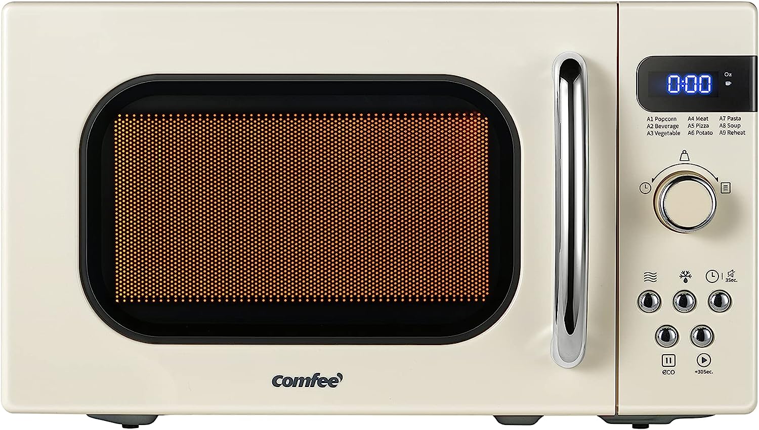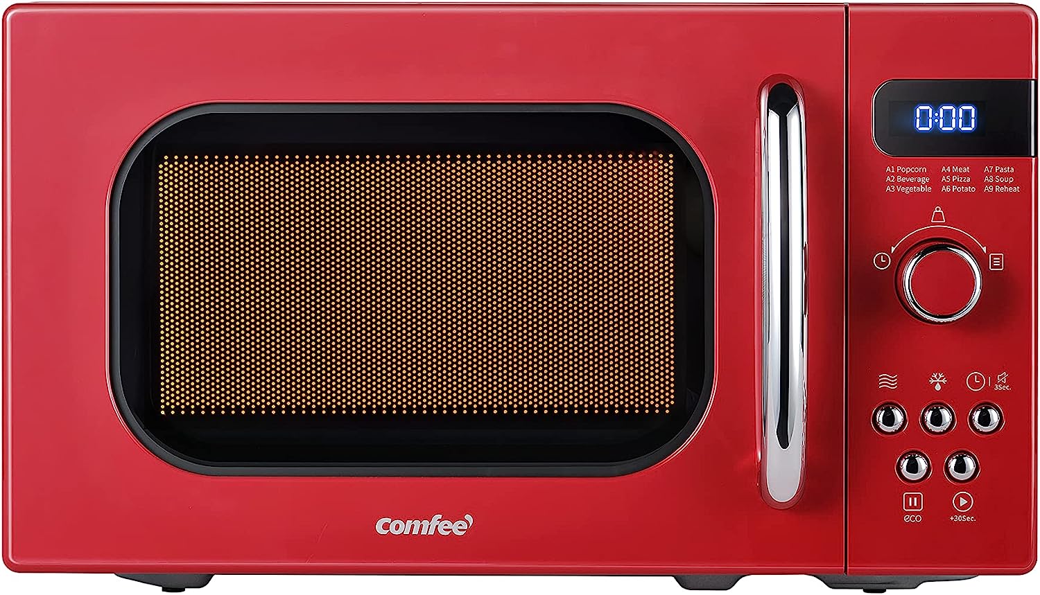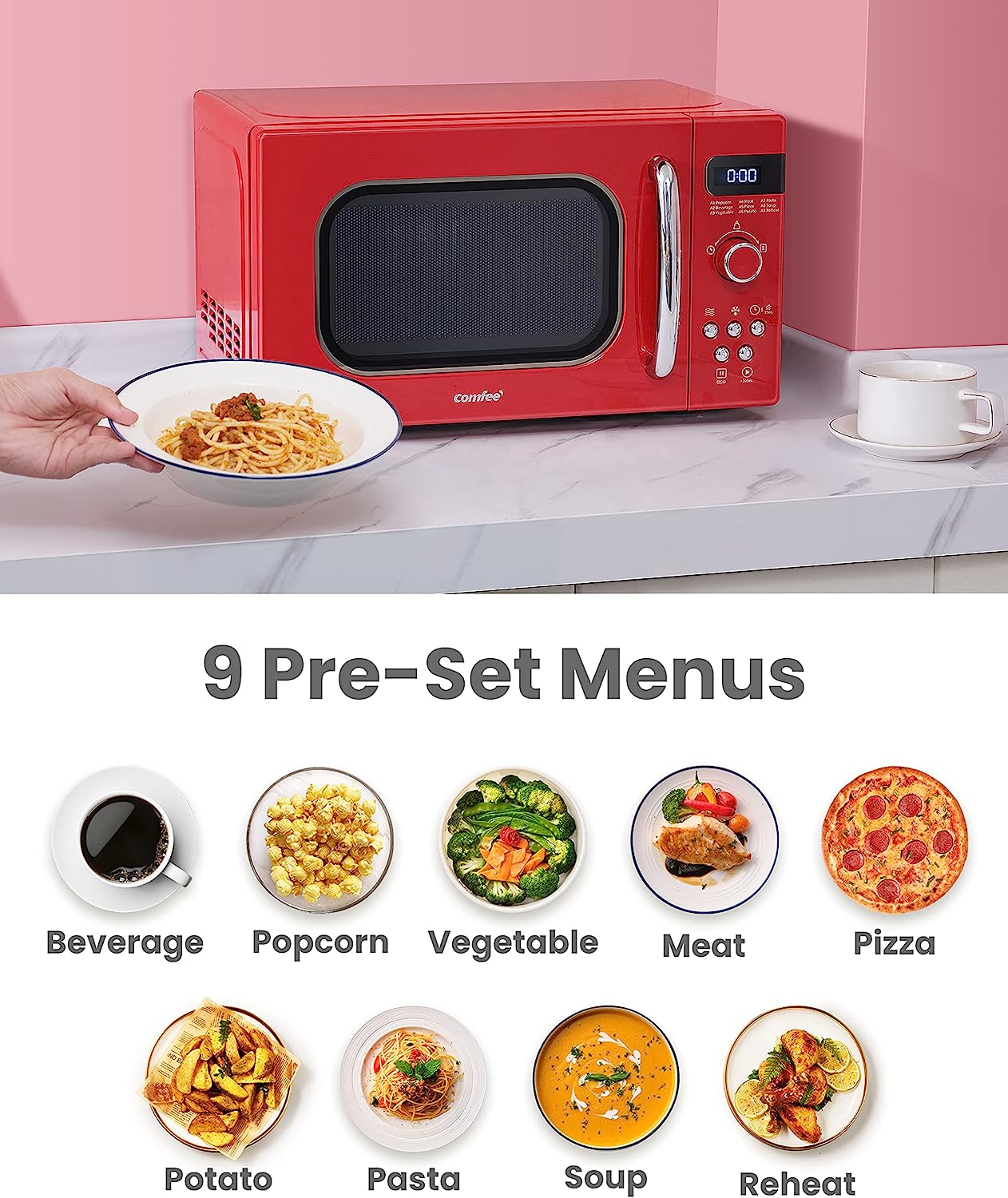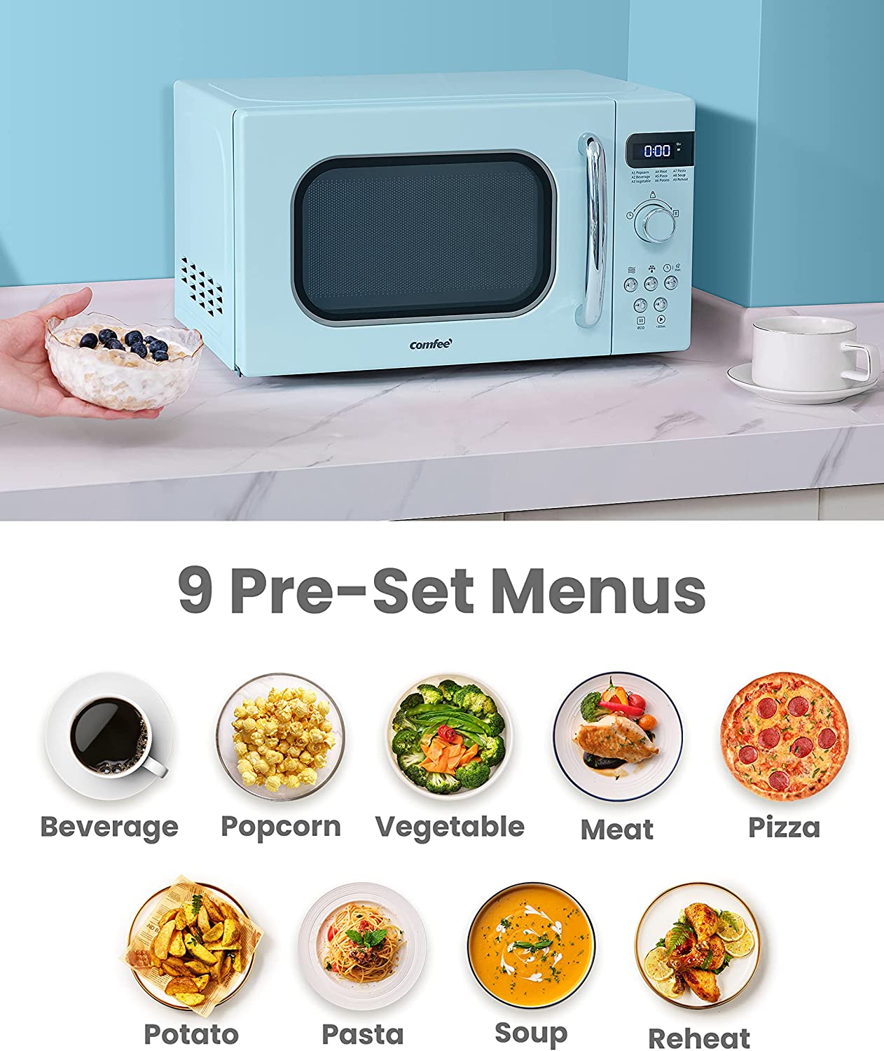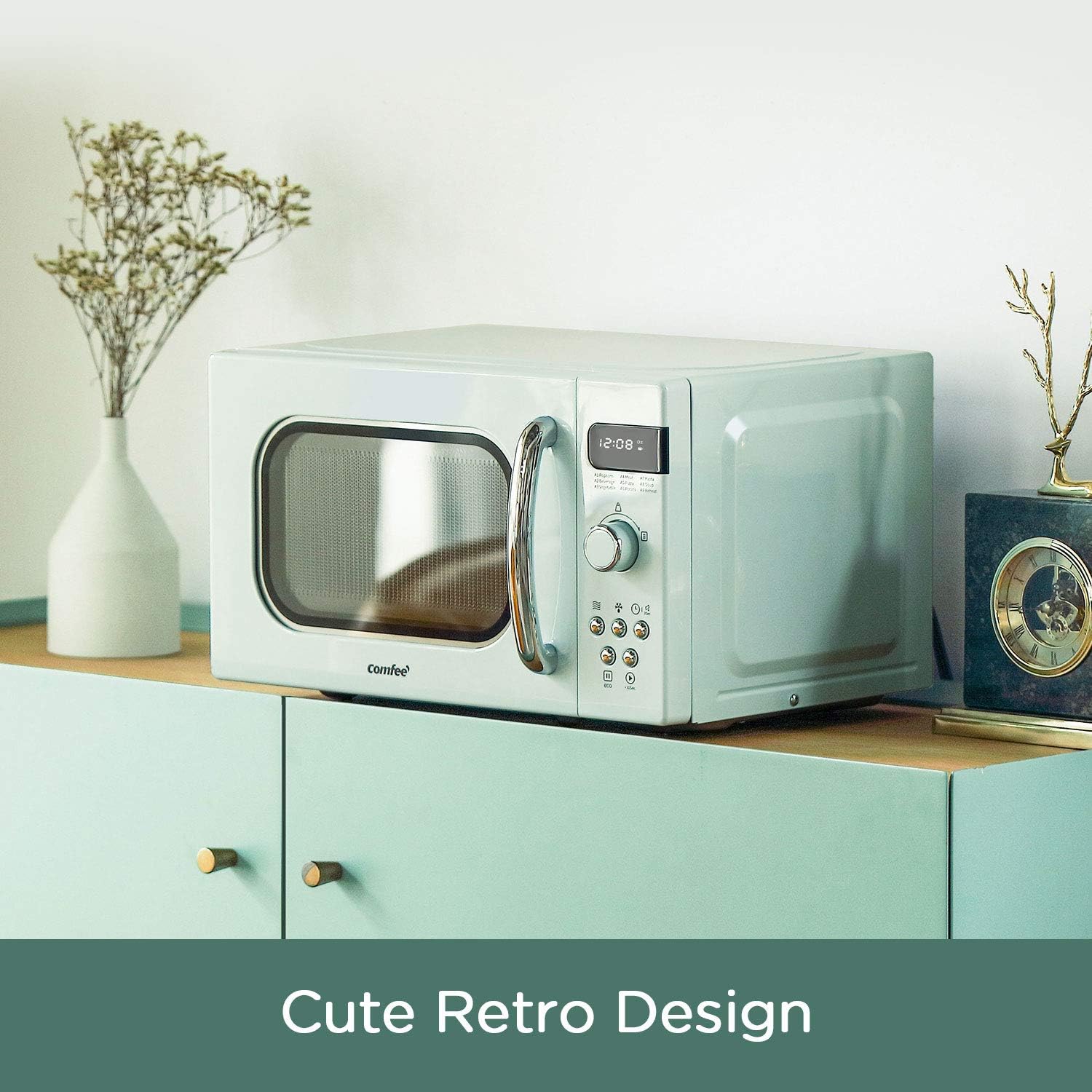 This COMFEE' 0.7 cubic feet 700 watts retro style microwave oven is inspired from those good old days, and refined by modern style and practical functions. It features 9 auto menus, easy defrosting function, microwave cooking with 10 power levels and an express cooking button. It is equipped with position memory turntable, energy saving eco mode, a mute button, clock and kitchen timer. The bright LED digital display, easy-to-read control panel and cool-touch rounded buttons further improve the user experience. And the compact size is ideal for apartment kitchens, vacation homes, offices and dorms.