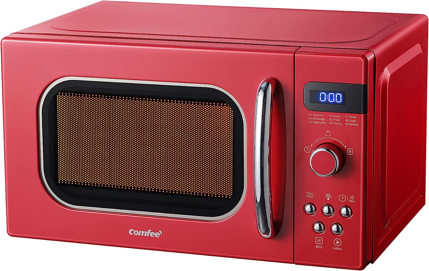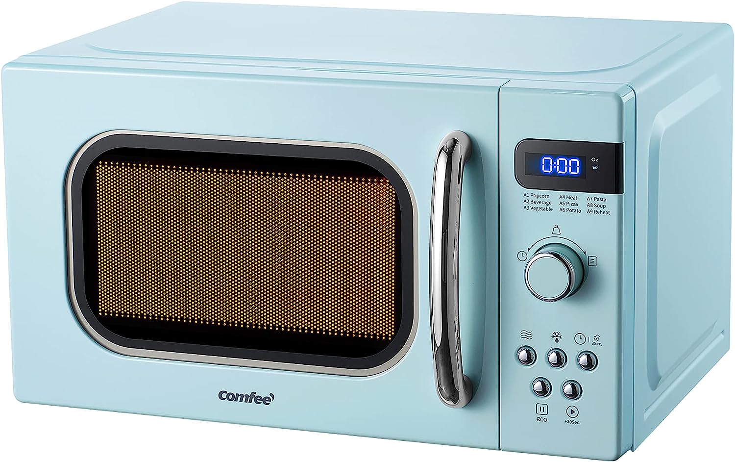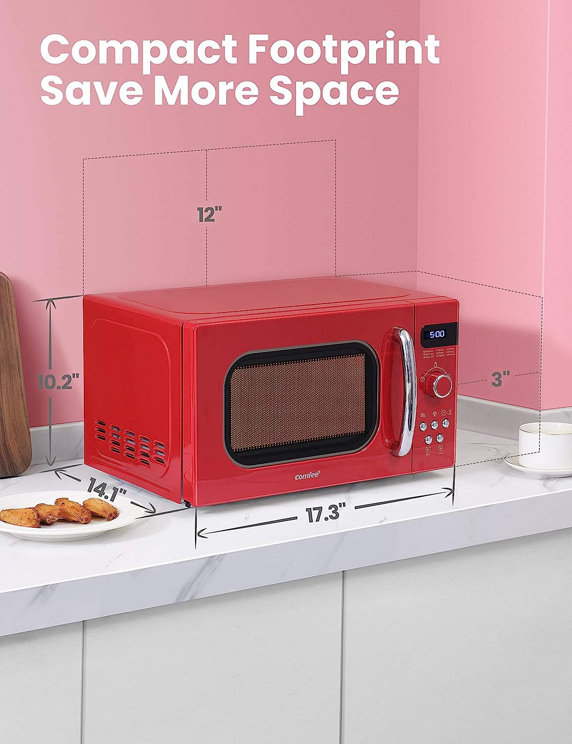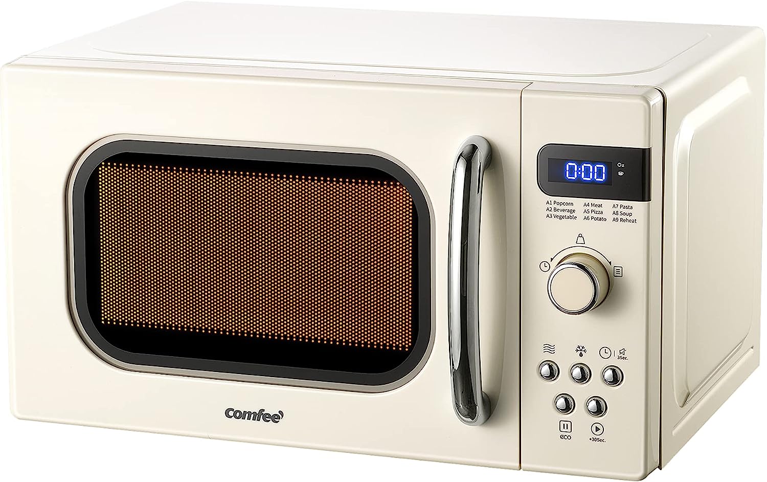 This COMFEE' 0.7 cubic feet 700 watts retro style microwave oven is inspired from those good old days, and refined by modern style and practical functions. It features 9 auto menus, easy defrosting function, microwave cooking with 10 power levels and an express cooking button. It is equipped with position memory turntable, energy saving eco mode, a mute button, clock and kitchen timer. The bright LED digital display, easy-to-read control panel and cool-touch rounded buttons further improve the user experience. And the compact size is ideal for apartment kitchens, vacation homes, offices and dorms.